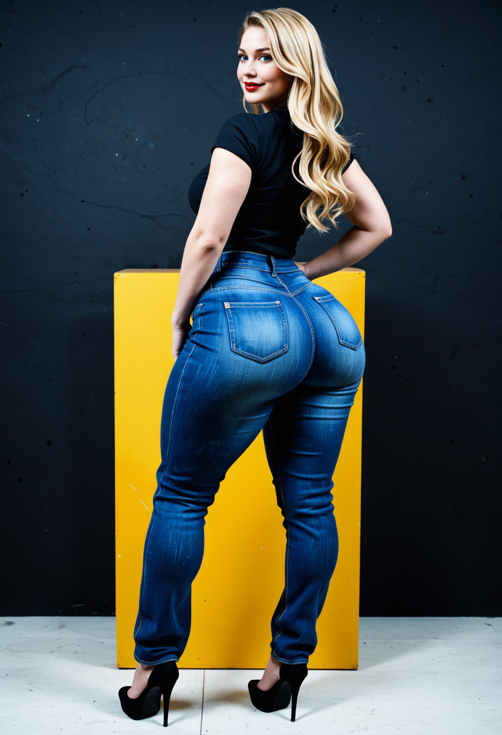 The image shows a woman standing on a yellow box with her back to the camera, wearing a black top and a pair of plus size jeans. The background of the image is a wall.