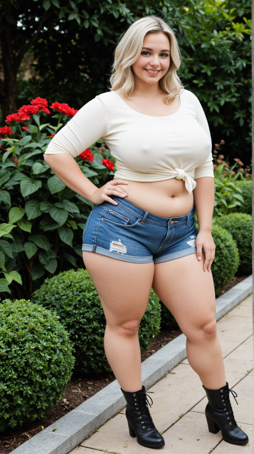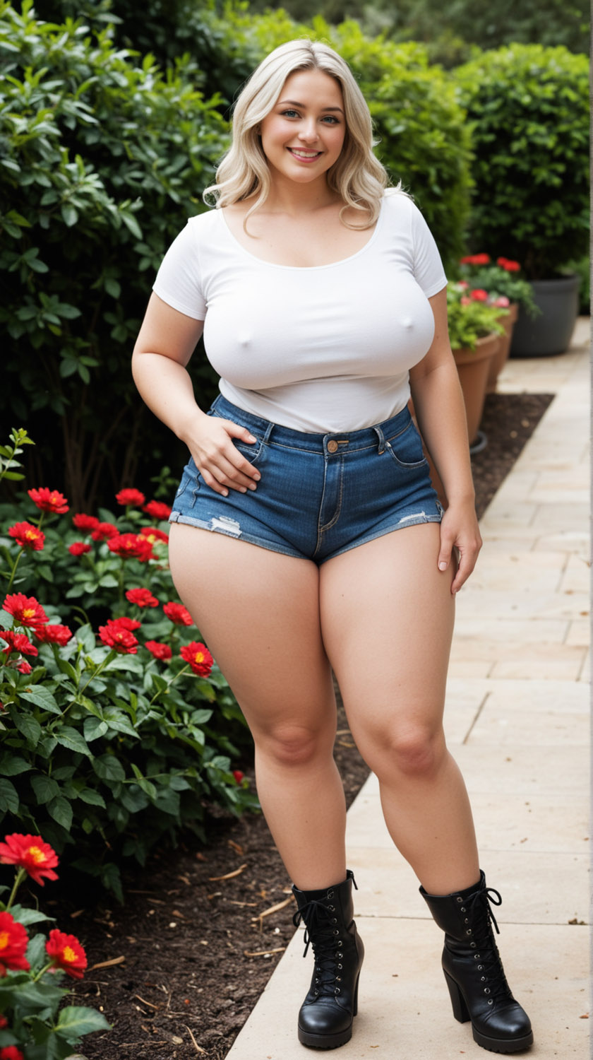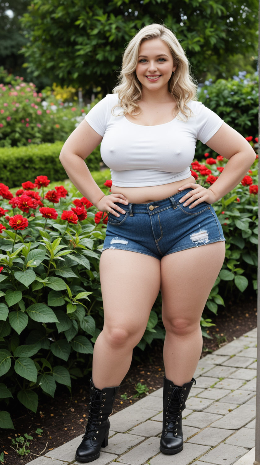 The image is a full-length portrait of a young woman standing in a garden. She is wearing a white t-shirt and high-waisted denim shorts, paired with black ankle boots. She has blonde hair and is smiling at the camera. The background is filled with greenery and red flowers, and there is a stone wall on the right side of the image. The woman is standing with one hand on her hip and the other resting on her thigh.