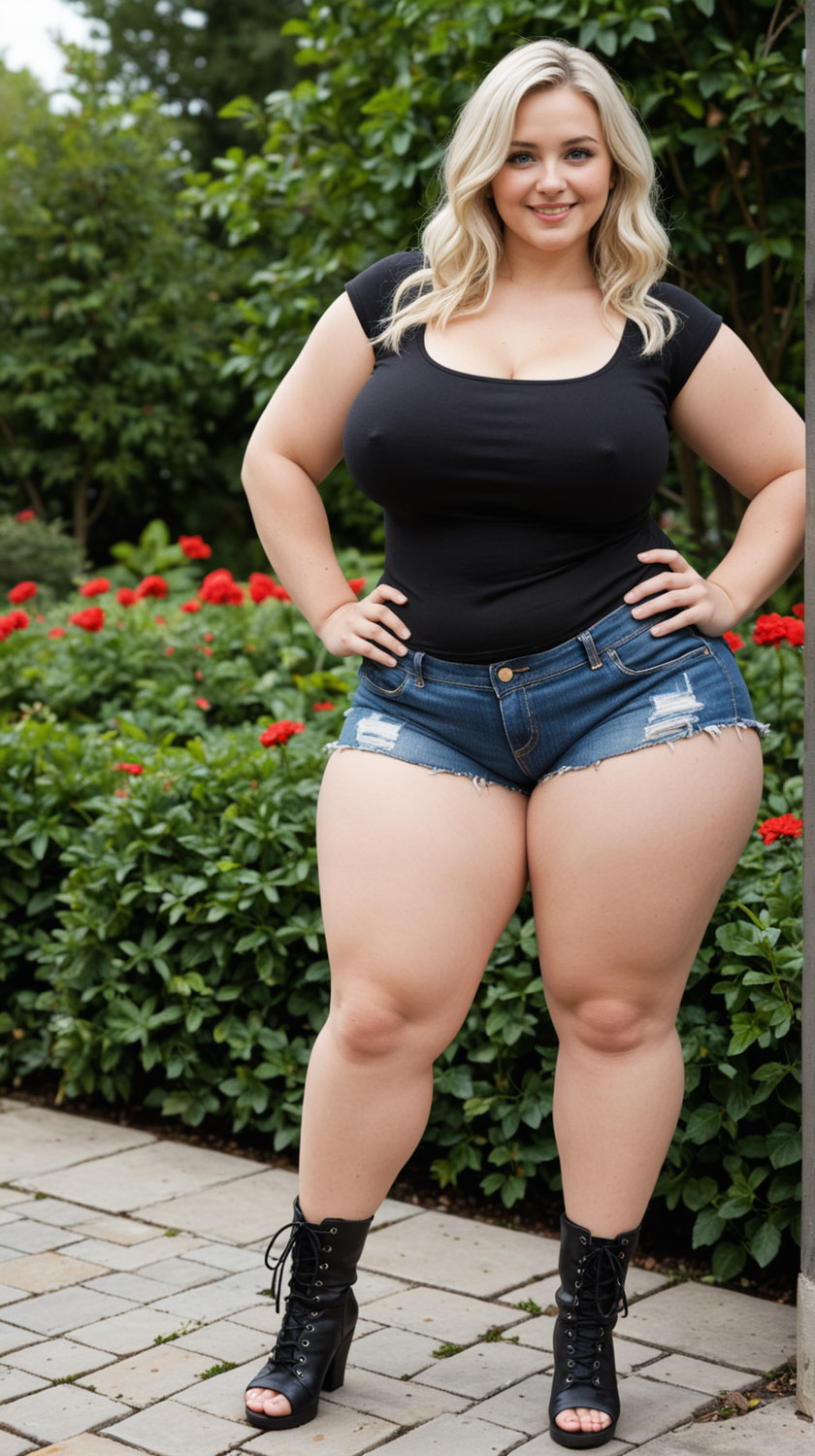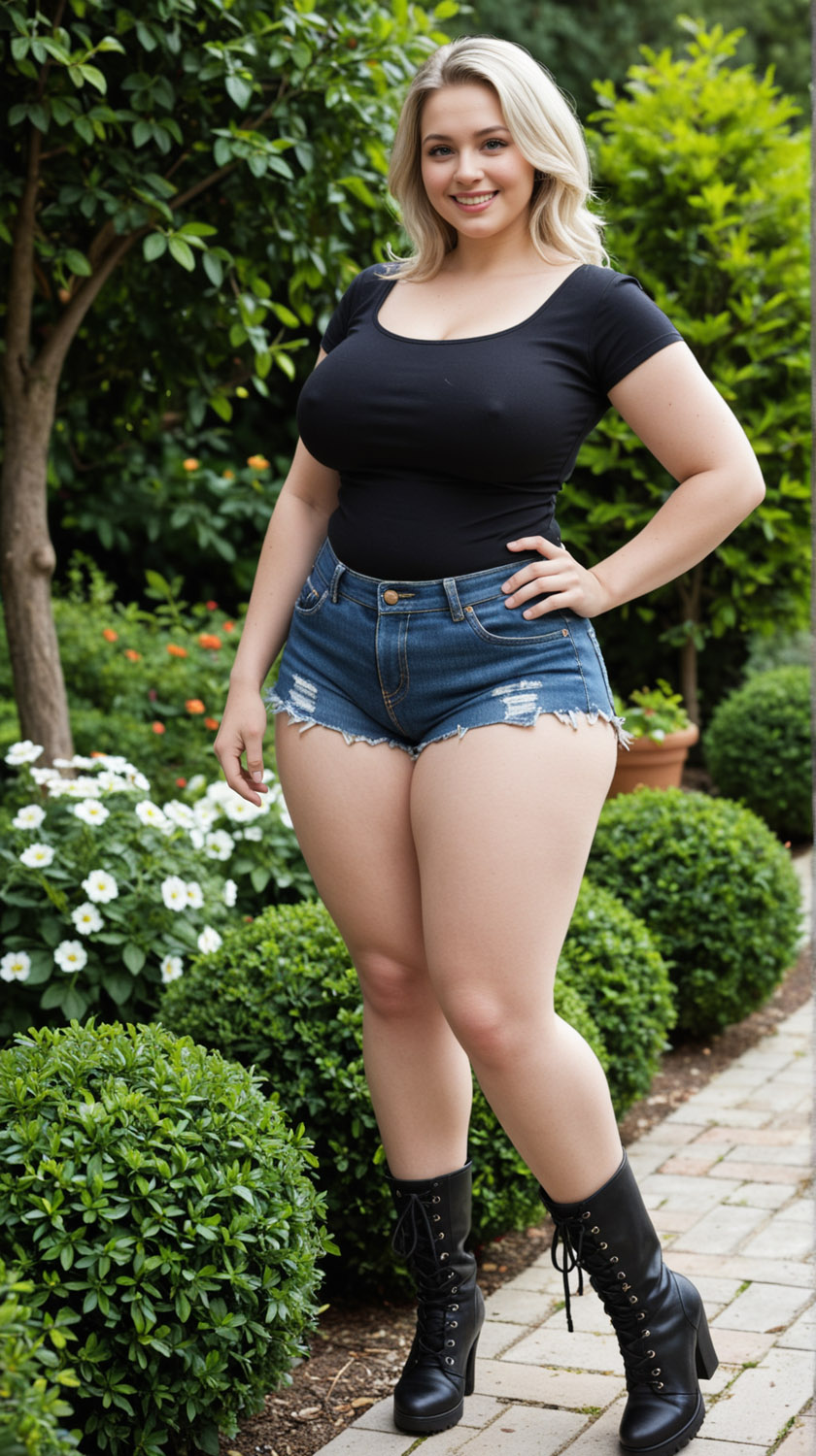 The image shows a young woman standing in a garden with her hands on her hips. She is wearing a black t-shirt and denim shorts with frayed edges. She has blonde hair styled in loose waves and is smiling at the camera. The woman is also wearing black lace-up boots with a chunky heel. The background is filled with greenery and colorful flowers. The overall mood of the image is happy and confident.