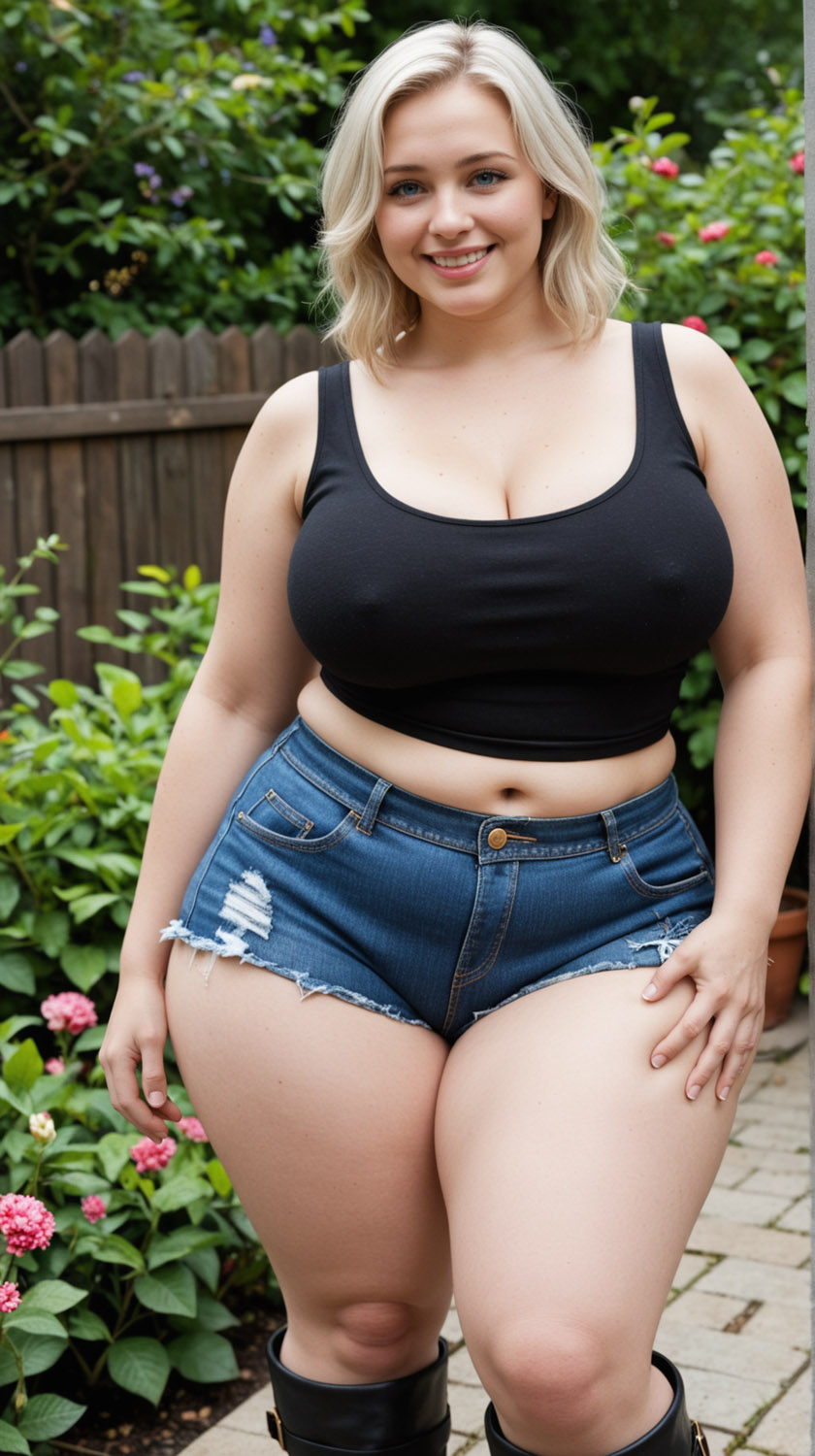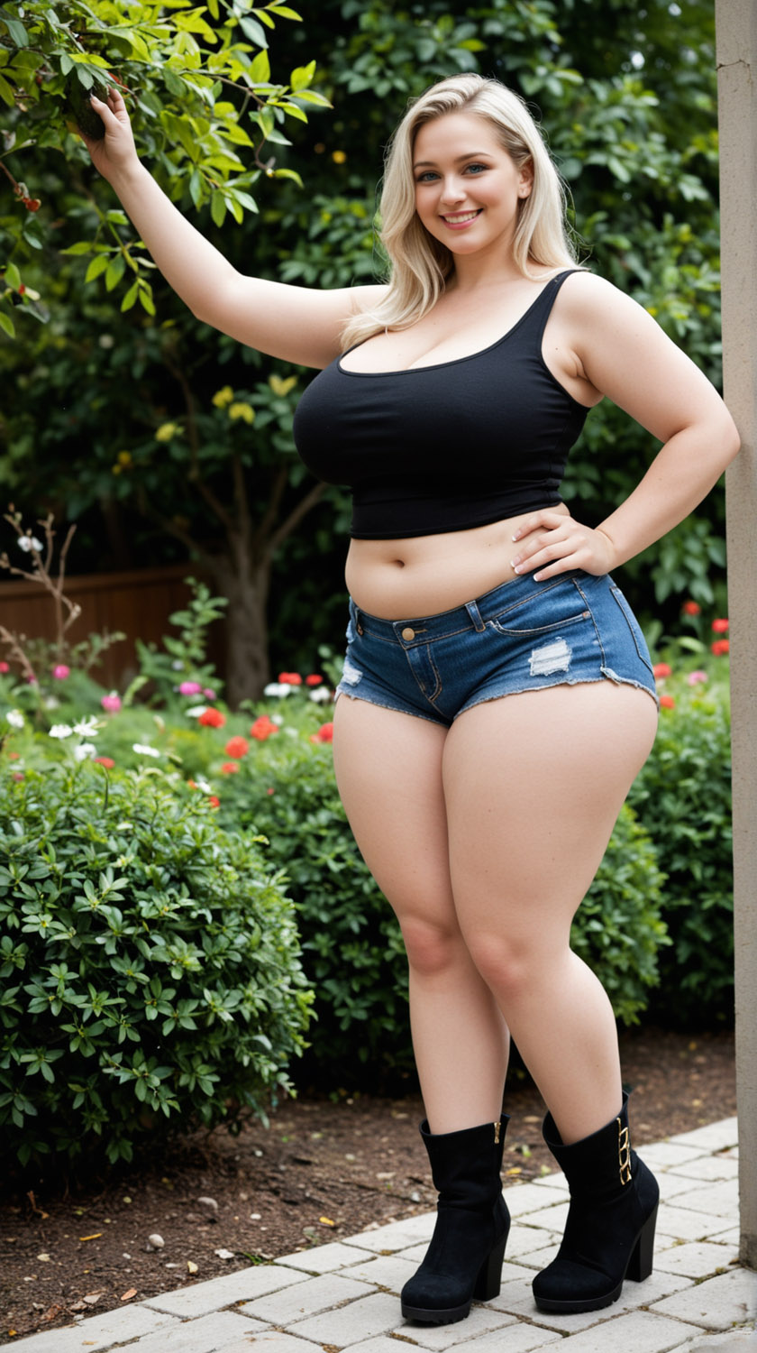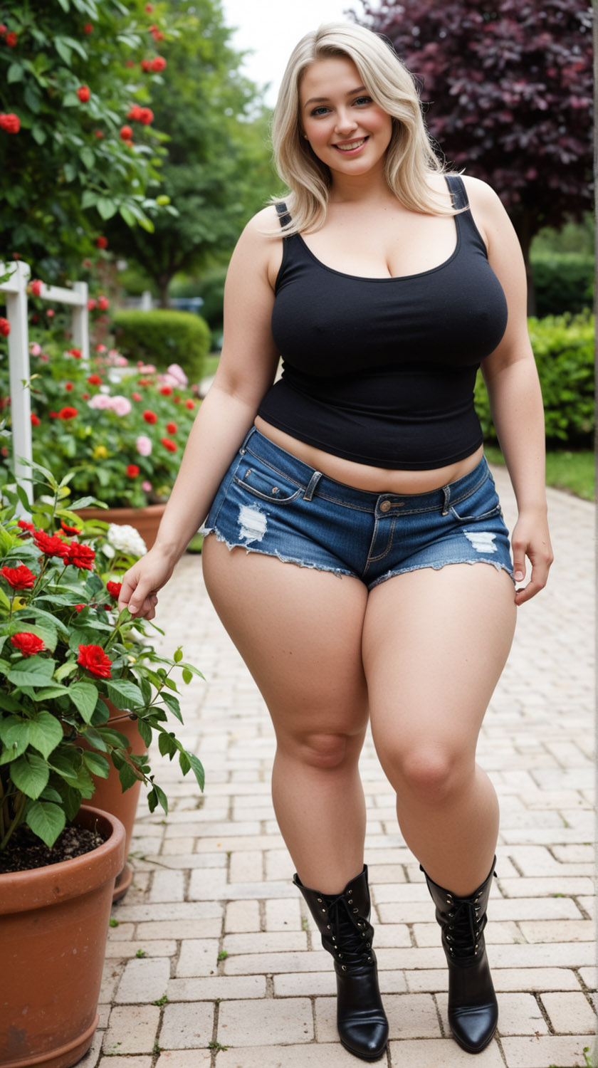 The image shows a young woman standing in a garden with potted plants and flowers. She is wearing a black tank top and denim shorts with frayed edges. She has blonde hair and is smiling at the camera. The woman is standing on a brick pathway with her legs slightly apart and her hands resting on her hips. She also has a pair of black ankle boots on her feet. The background is blurred, but it appears to be a garden or park with trees and bushes.