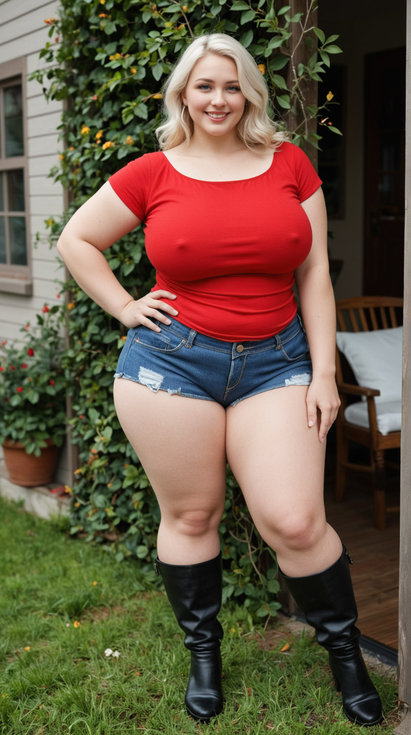The image is a portrait of a young woman standing on a porch. She is wearing a red t-shirt and denim shorts, with black knee-high boots. She has blonde hair and is smiling at the camera. Her body is turned slightly to the side, with one hand on her hip and the other resting on her thigh. The porch is surrounded by greenery and there is a wooden bench in the background. The overall mood of the image is casual and relaxed.