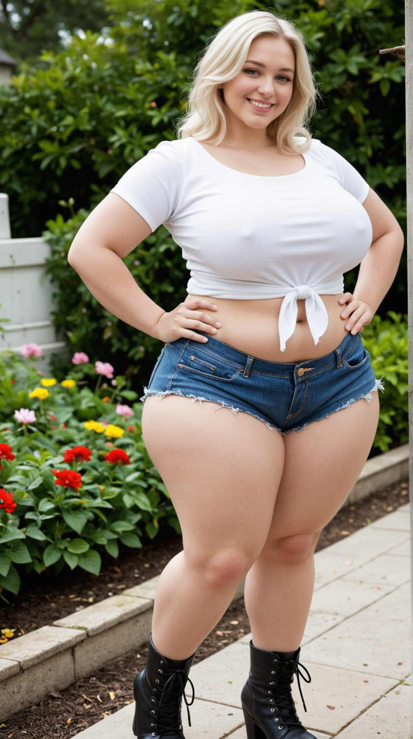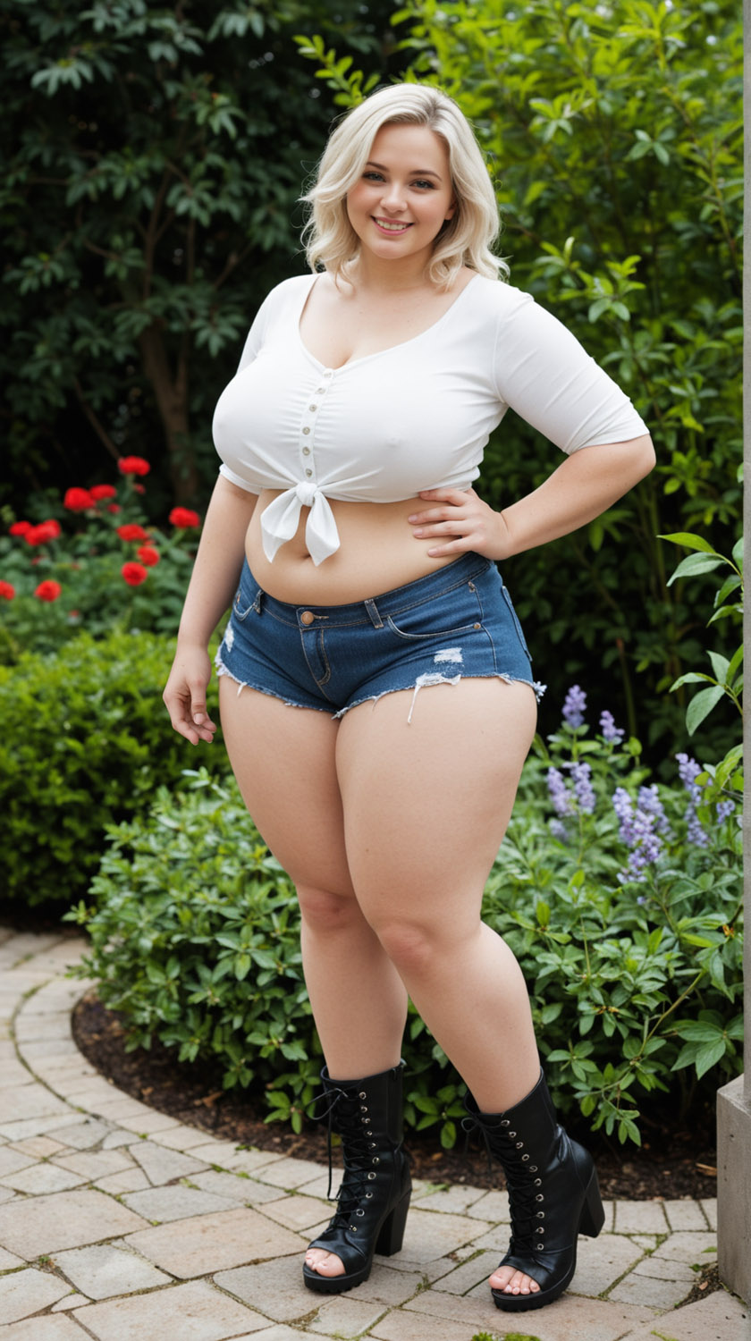 The image shows a young woman standing in a garden with a brick pathway and a wooden fence in the background. She is wearing a white t-shirt and high-waisted denim shorts with frayed edges and black lace-up boots. She has blonde hair and is smiling at the camera. The woman is standing with one hand on her hip and the other resting on her thigh. The garden is filled with colorful flowers and greenery.