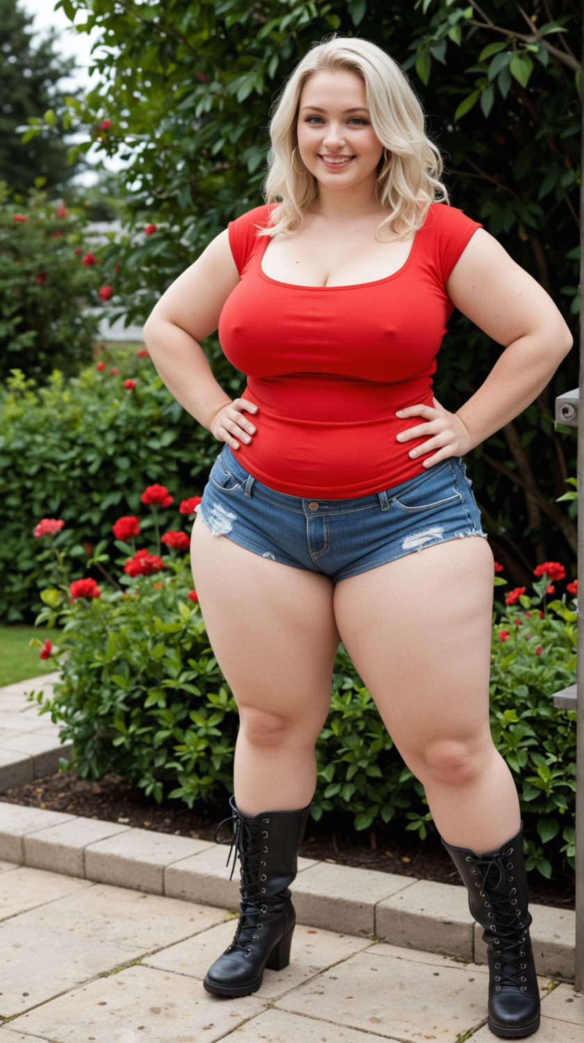 The image is a portrait of a young woman standing in a garden. She is wearing a red t-shirt and denim shorts, with black ankle boots. She has blonde hair and is smiling at the camera. Her body is turned slightly to the side, with one hand on her hip and the other resting on her thigh. The background is filled with greenery and red flowers, and there is a wooden fence in the distance. The overall mood of the image is happy and relaxed.