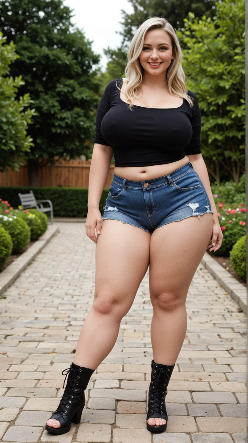 The image shows a young woman standing in a garden with her hands on her hips. She is wearing a black crop top and denim shorts with frayed edges. She has blonde hair and is smiling at the camera. The woman is also wearing black knee-high boots. The garden has a brick pathway and a variety of plants and flowers. The background is blurred, but it appears to be a sunny day.