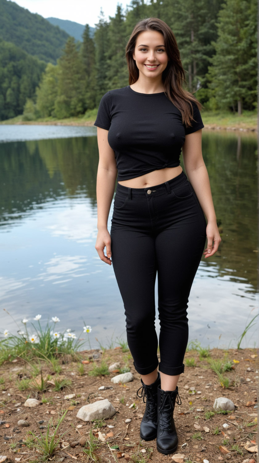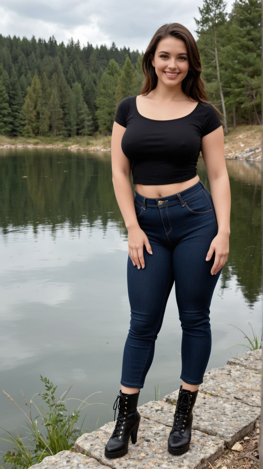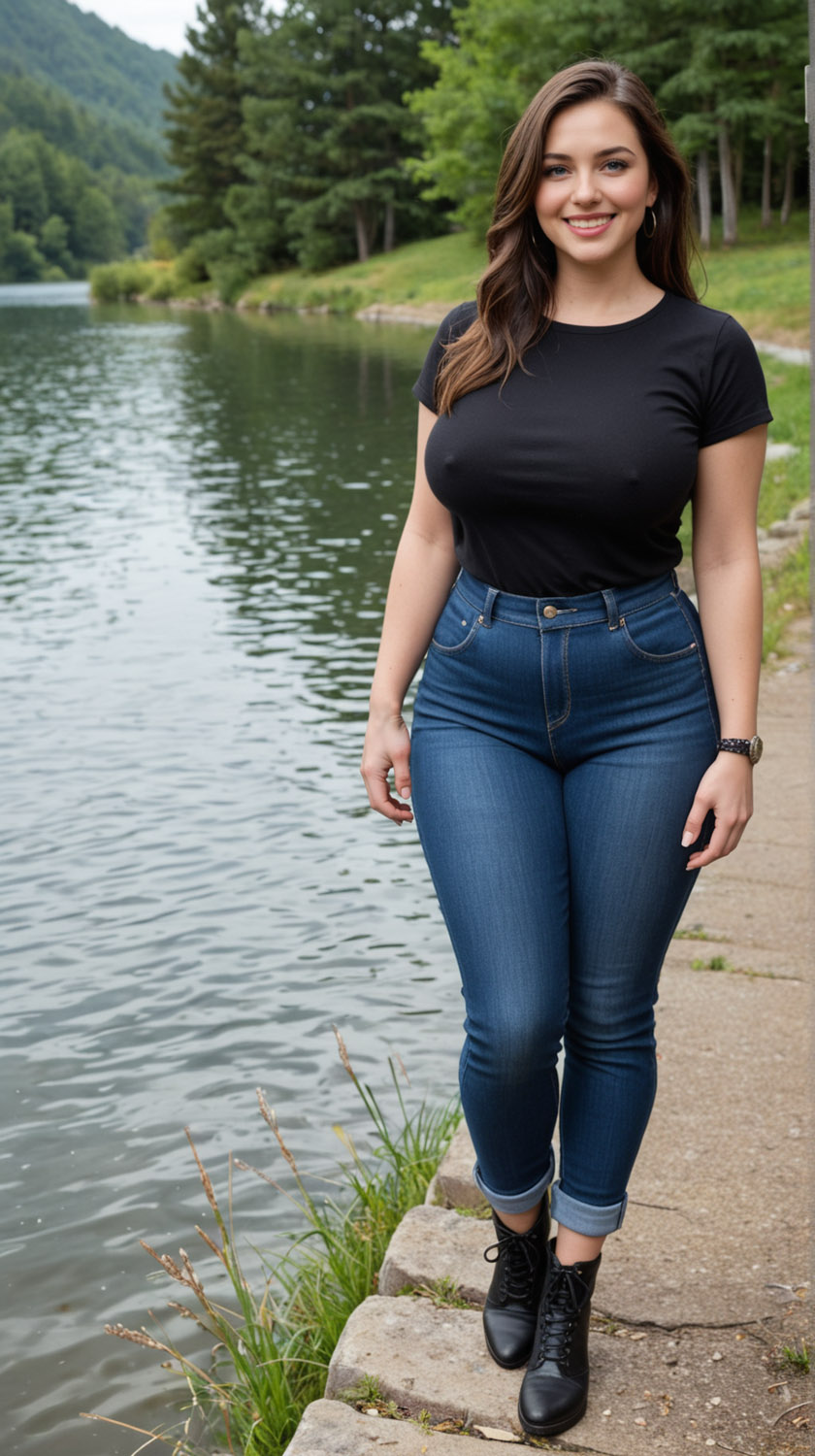 The image shows a young woman standing on a stone pathway next to a lake. She is wearing a black t-shirt, blue jeans, and black ankle boots. She has long brown hair and is smiling at the camera. The lake is surrounded by trees and there is a hill in the background. The sky is overcast and the overall mood of the image is peaceful and serene.