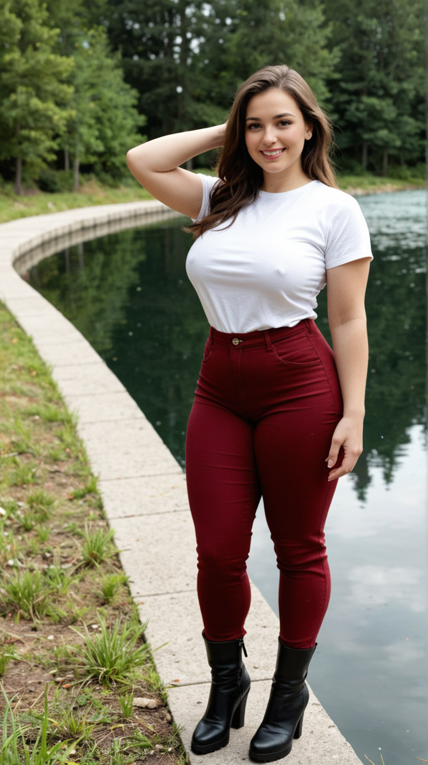 The image shows a young woman standing on a concrete pathway next to a body of water. She is wearing a white t-shirt and maroon high-waisted jeans. She has long brown hair and is smiling at the camera. Her left hand is resting on her hip and she is wearing black ankle boots. The background is filled with trees and greenery. The overall mood of the image is casual and relaxed.