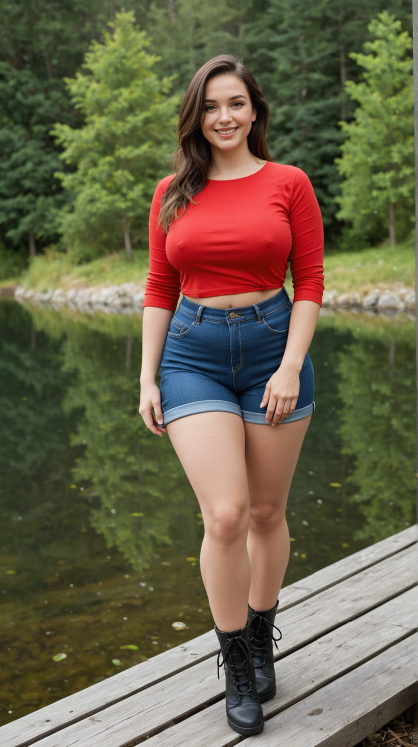 The image is a portrait of a young woman standing on a wooden dock by a lake. She is wearing a red t-shirt, denim shorts, and black ankle boots. She has long brown hair and is smiling at the camera. The lake is surrounded by trees and greenery, and the sky is blue. The woman is standing with one hand on her hip and the other resting on her thigh. The overall mood of the image is happy and relaxed.