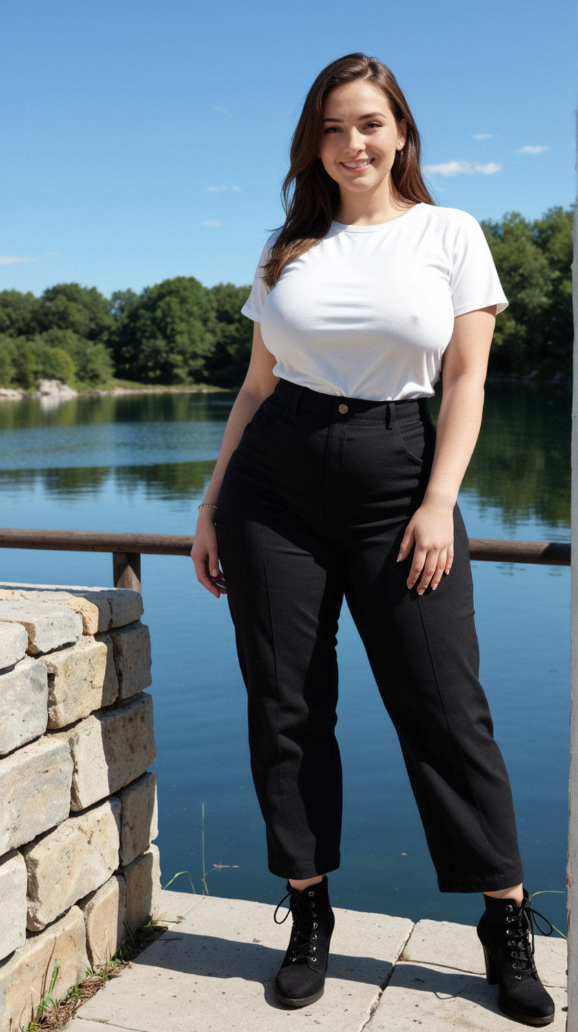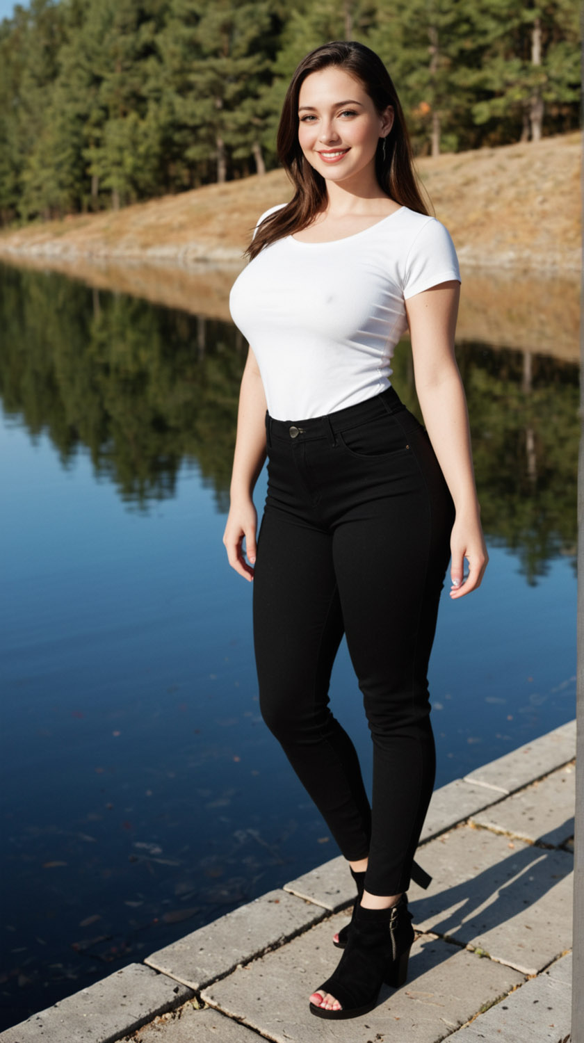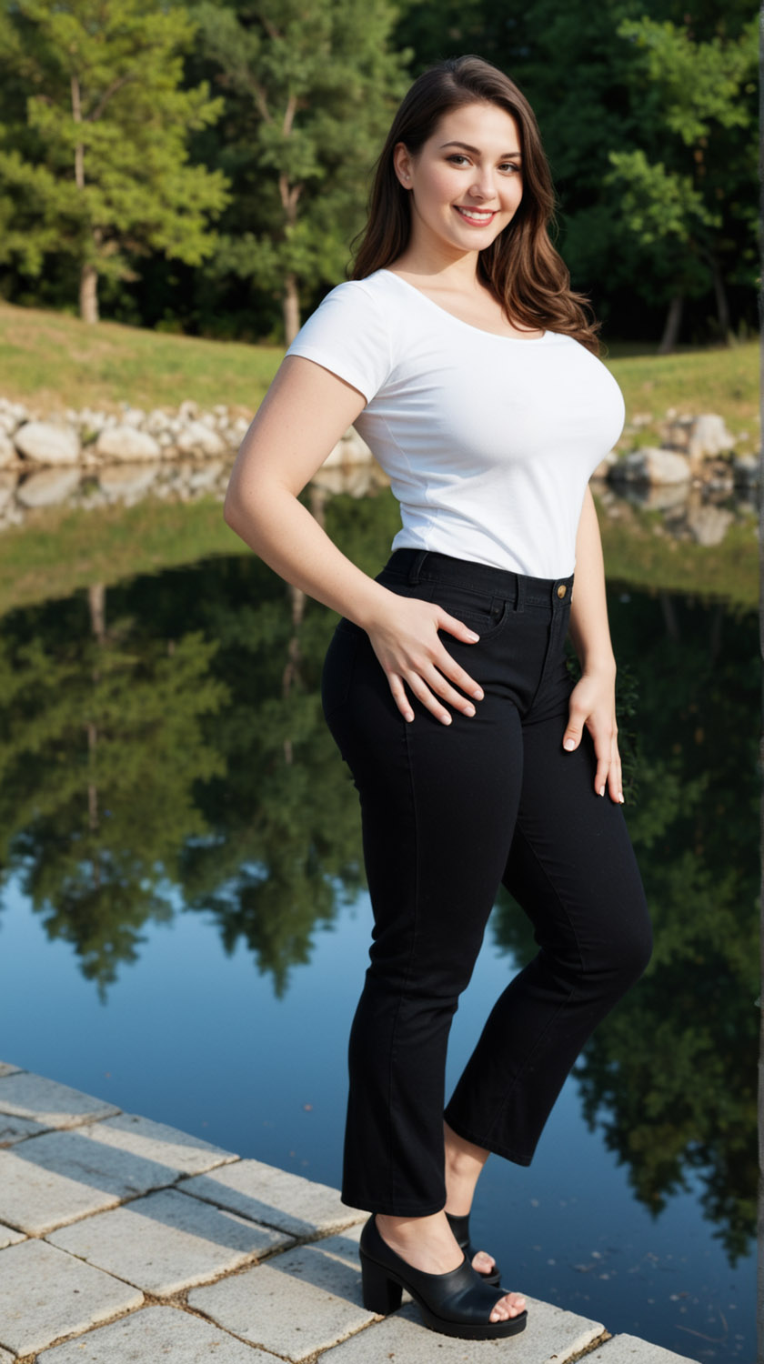 The image is a portrait of a young woman standing in front of a pond. She is wearing a white t-shirt and black high-waisted jeans. She has long brown hair and is smiling at the camera. Her hands are resting on her hips and she is wearing black heels. The pond is surrounded by trees and there are rocks in the background. The sky is blue and the overall mood of the image is happy and relaxed.
