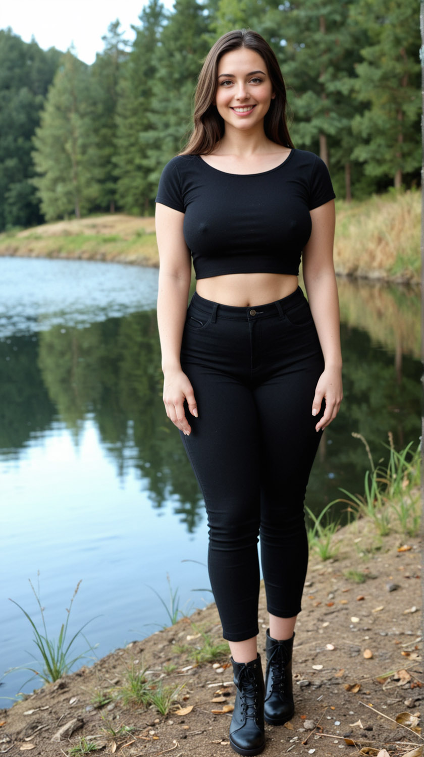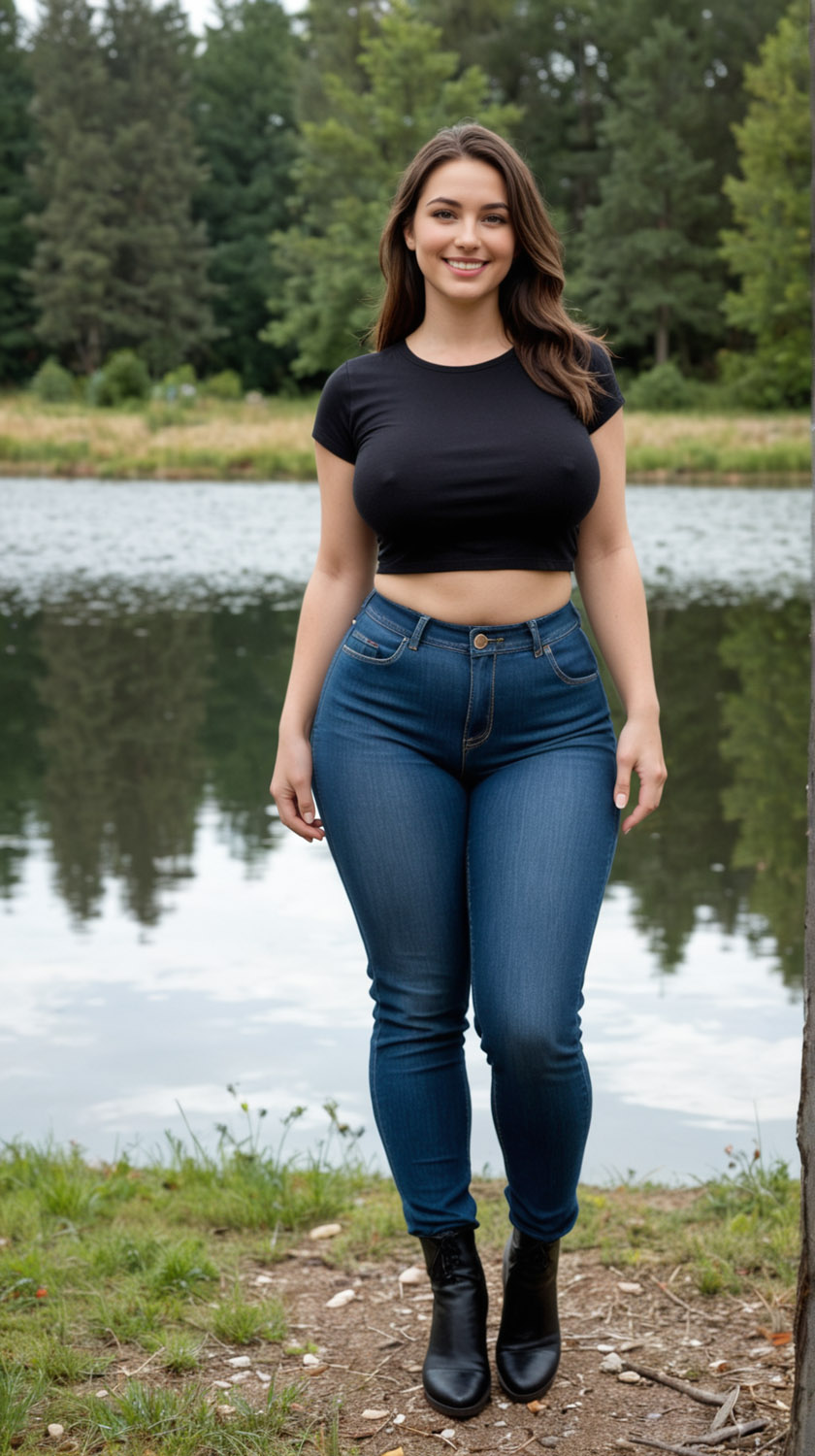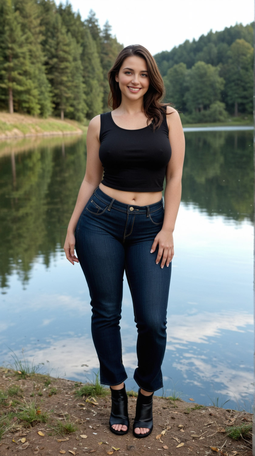 The image is a portrait of a young woman standing in front of a lake. She is wearing a black crop top and high-waisted blue jeans. She has long brown hair and is smiling at the camera. The lake is surrounded by trees and there is a wooden fence on the right side of the image. The sky is blue and the water is calm. The woman is standing with her hands on her hips and is posing with one hand on her hip. She appears to be confident and relaxed.