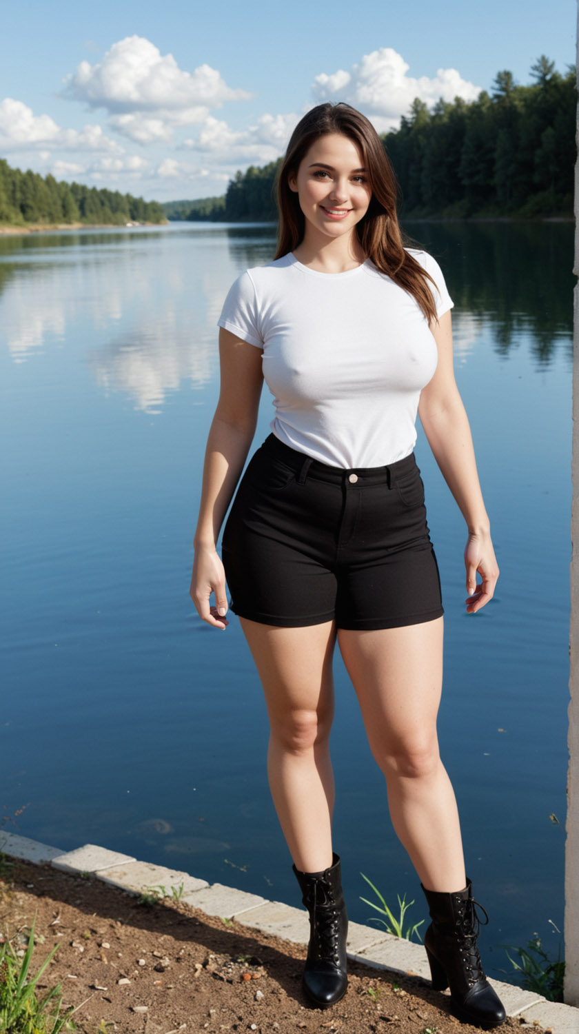 The image shows a young woman standing on the shore of a lake. She is wearing a white t-shirt and high-waisted denim shorts, paired with black ankle boots. She has long dark hair and is smiling at the camera. The lake is surrounded by trees and there is a clear blue sky in the background. The woman is standing with her hands on her hips and is posing with one hand on her hip. She appears to be confident and relaxed.