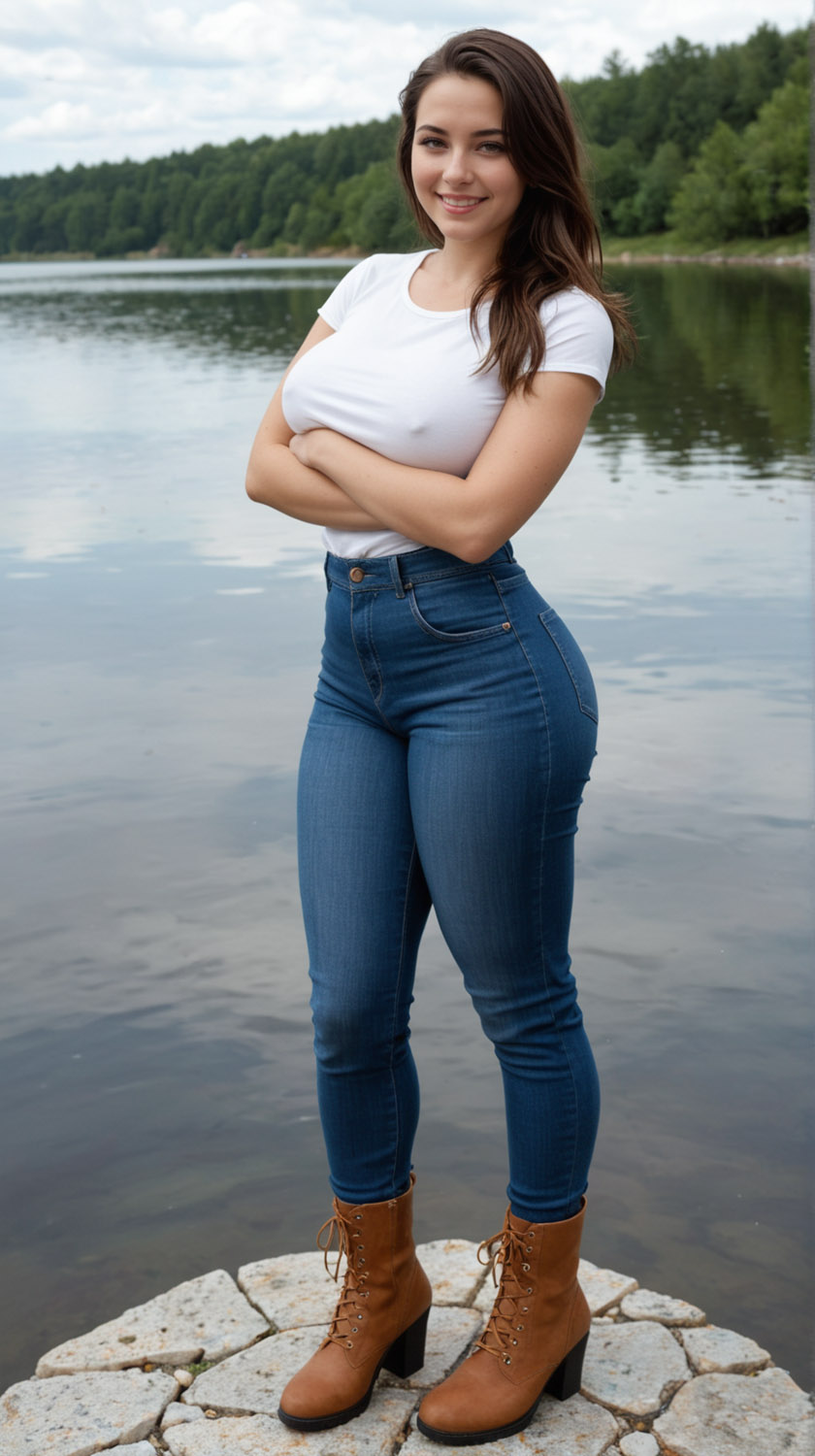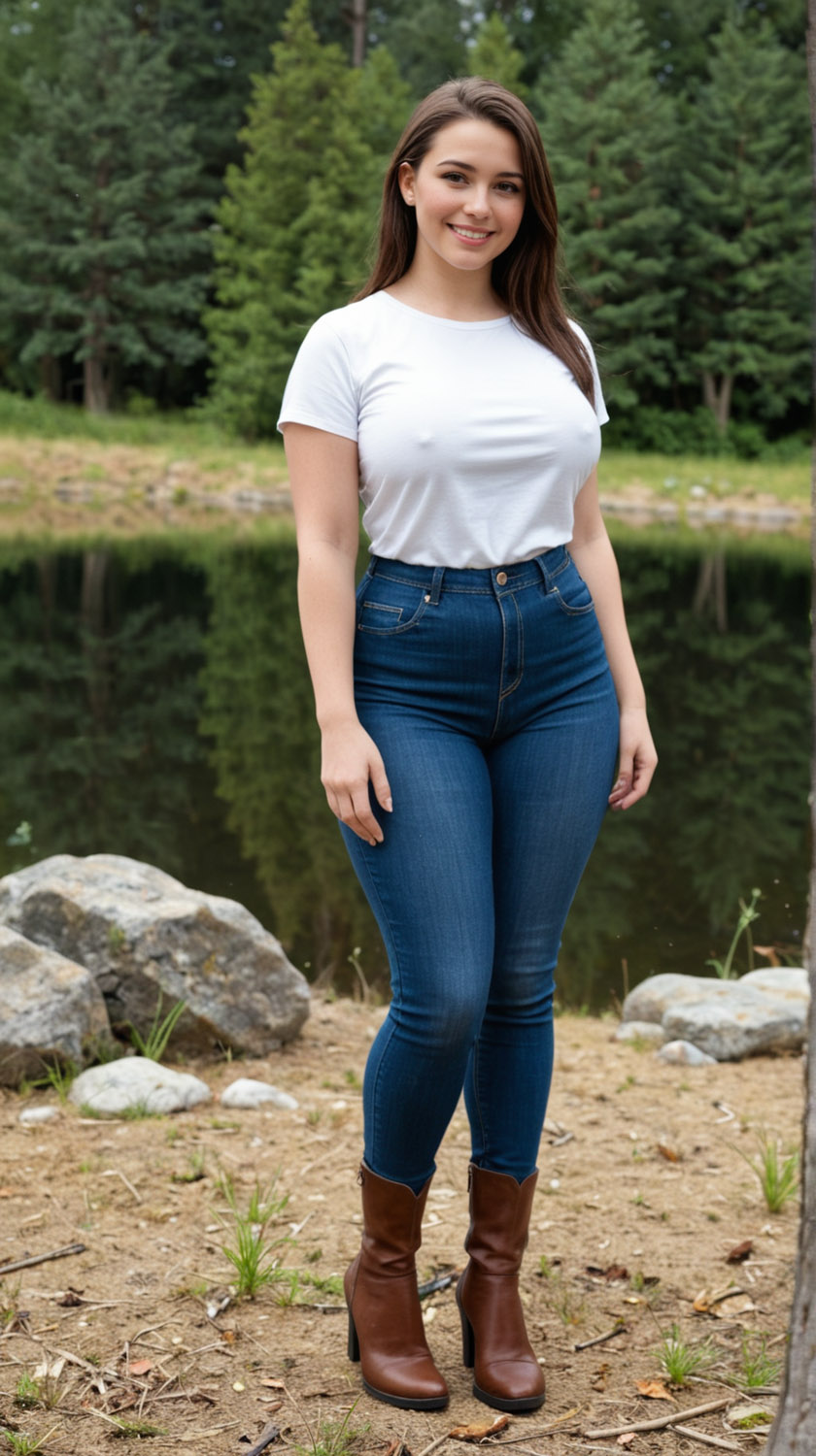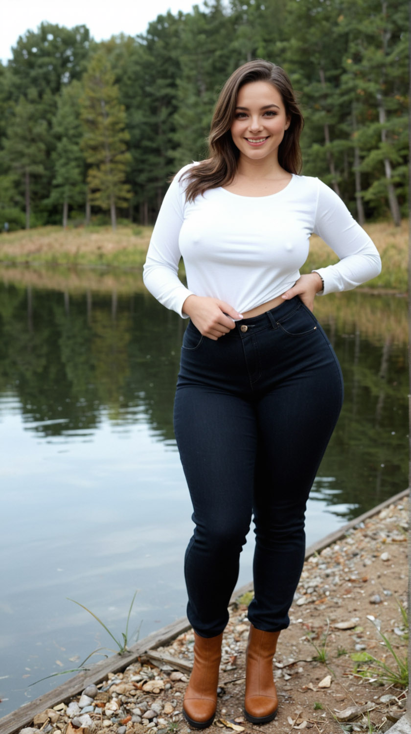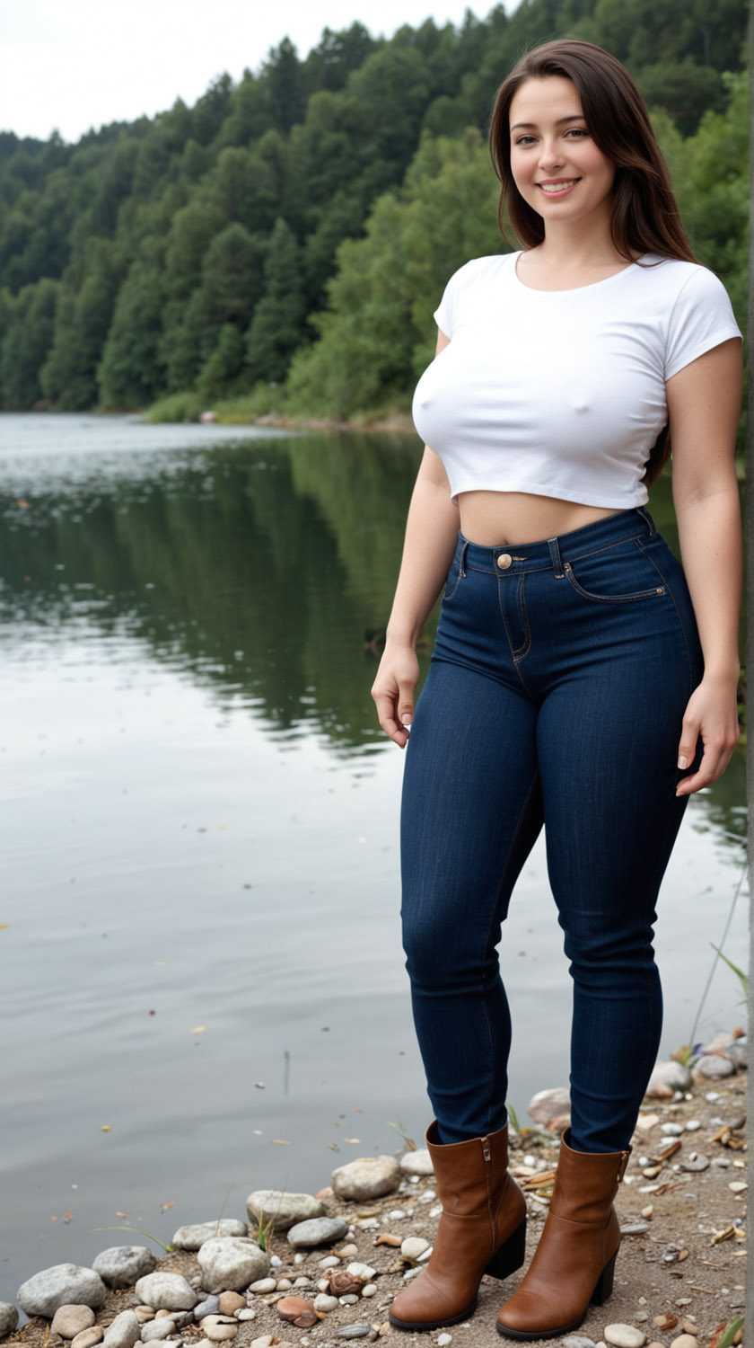 The image is a portrait of a young woman standing in front of a lake. She is wearing a white t-shirt, blue jeans, and brown ankle boots. She has long brown hair and is smiling at the camera. The woman is standing with her hands on her hips and her body is slightly turned to the side. The lake is surrounded by trees and there are rocks and fallen leaves scattered around. The sky is blue and the overall mood of the image is peaceful and serene.