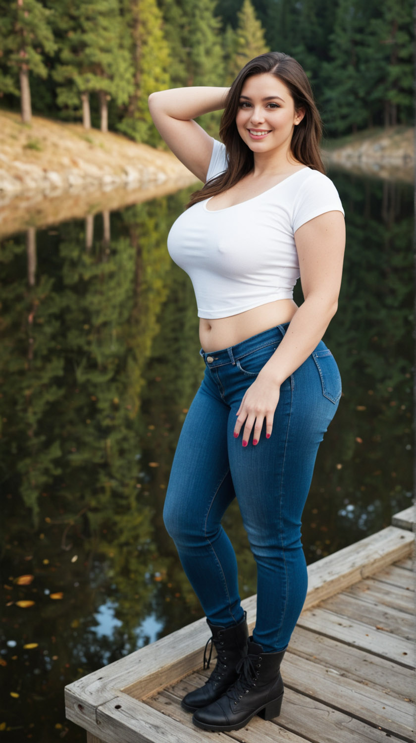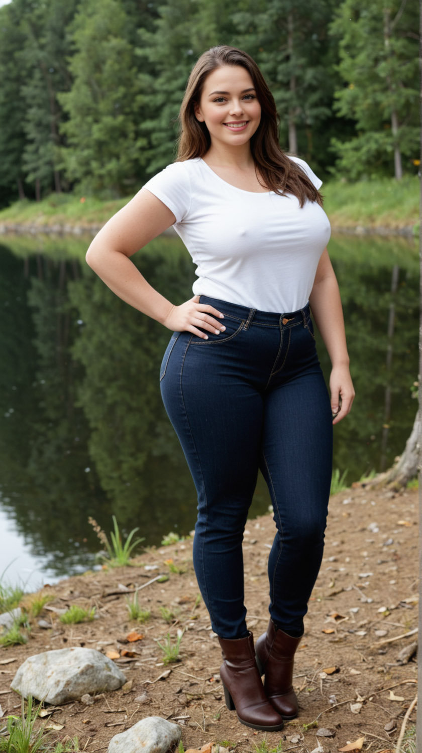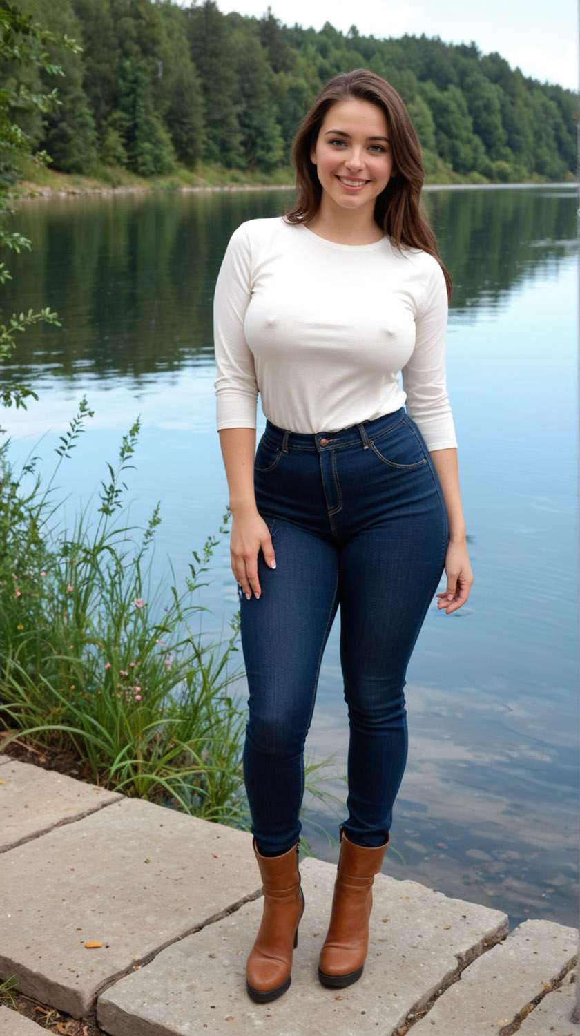 The image is a portrait of a young woman standing in front of a lake. She is wearing a white t-shirt, blue jeans, and brown ankle boots. She has long brown hair and is smiling at the camera. The woman is standing with her hands on her hips and her body is slightly turned to the side. The lake is surrounded by trees and there are rocks and fallen leaves scattered around. The sky is blue and the overall mood of the image is peaceful and serene.