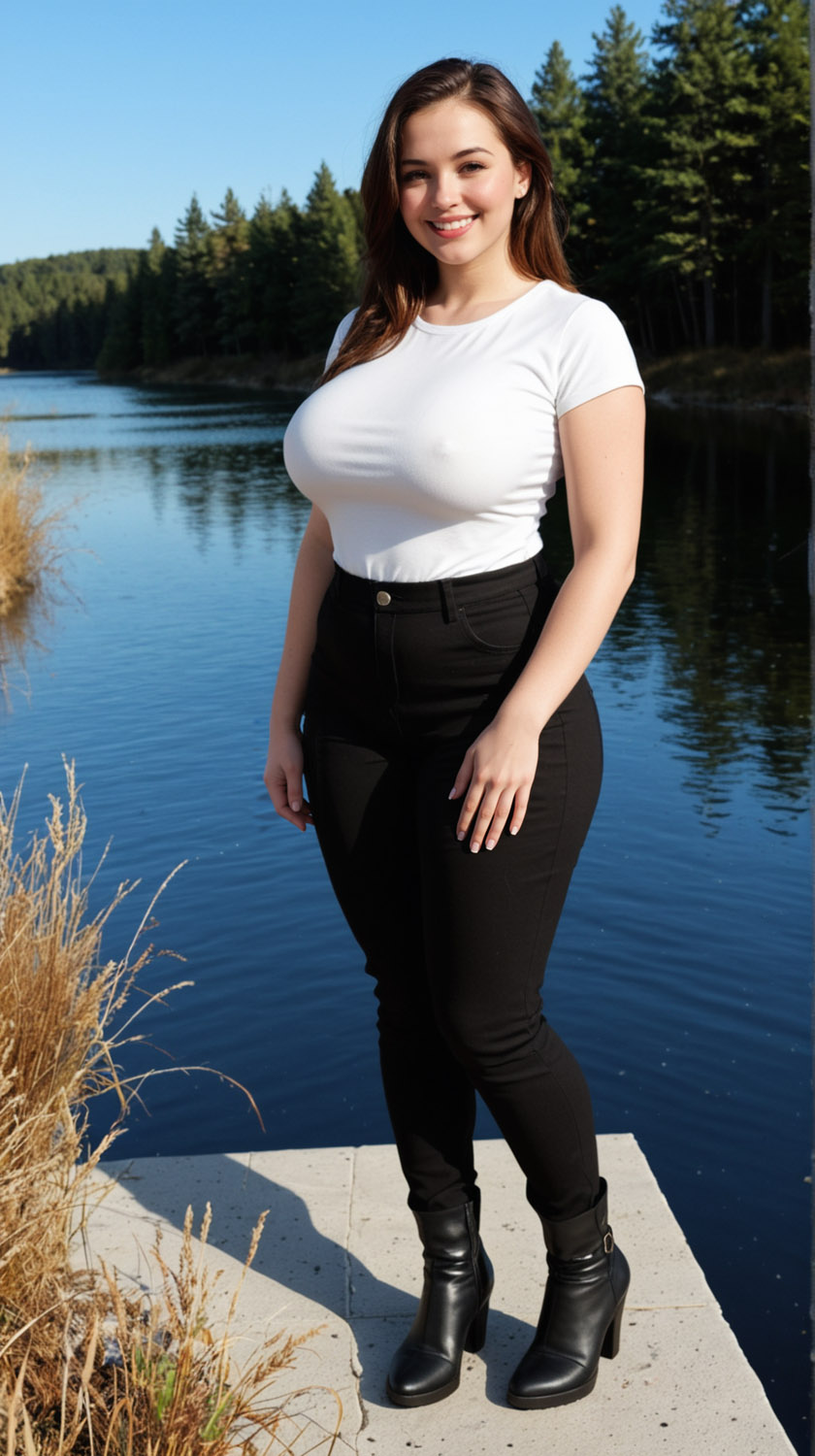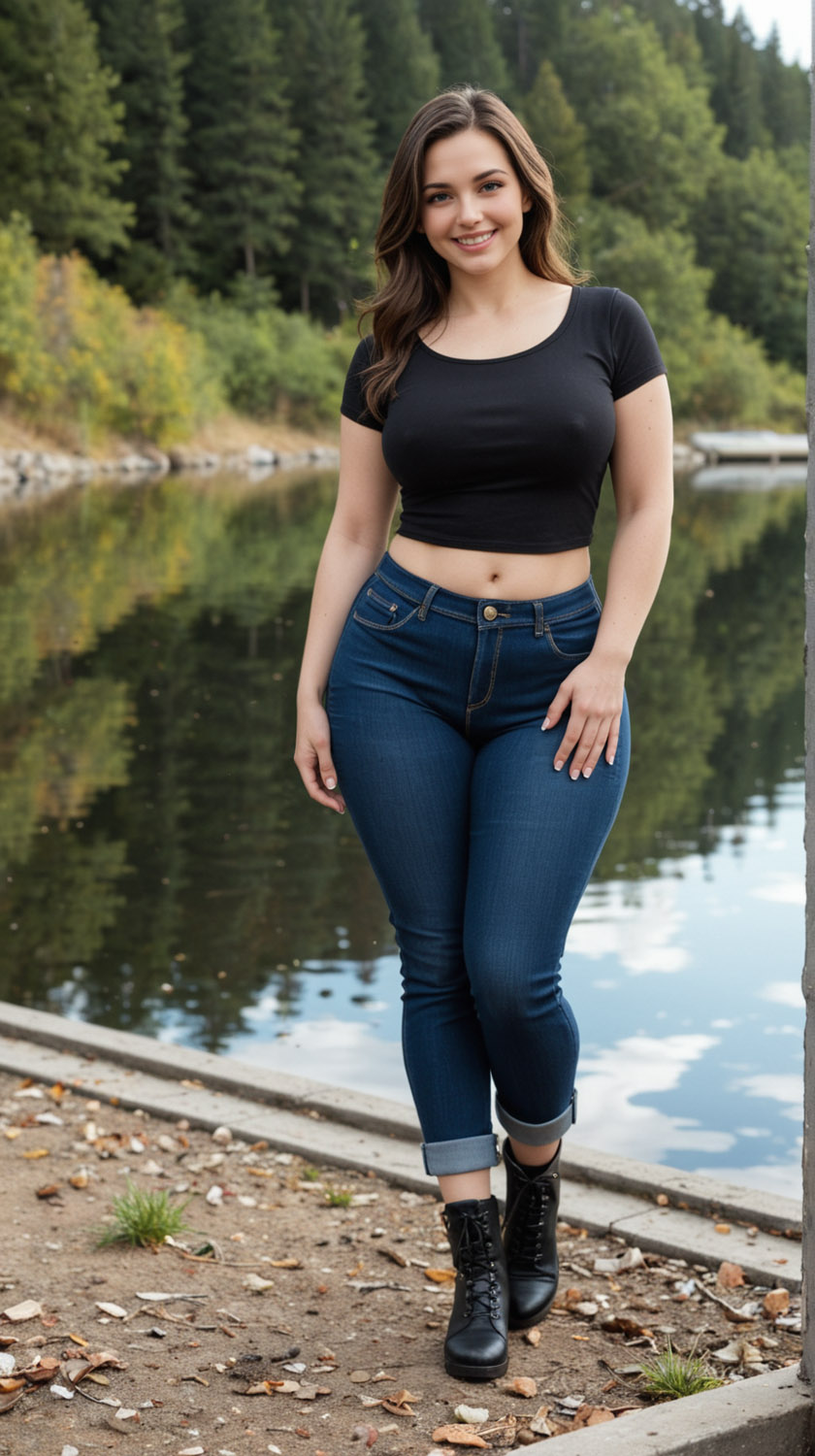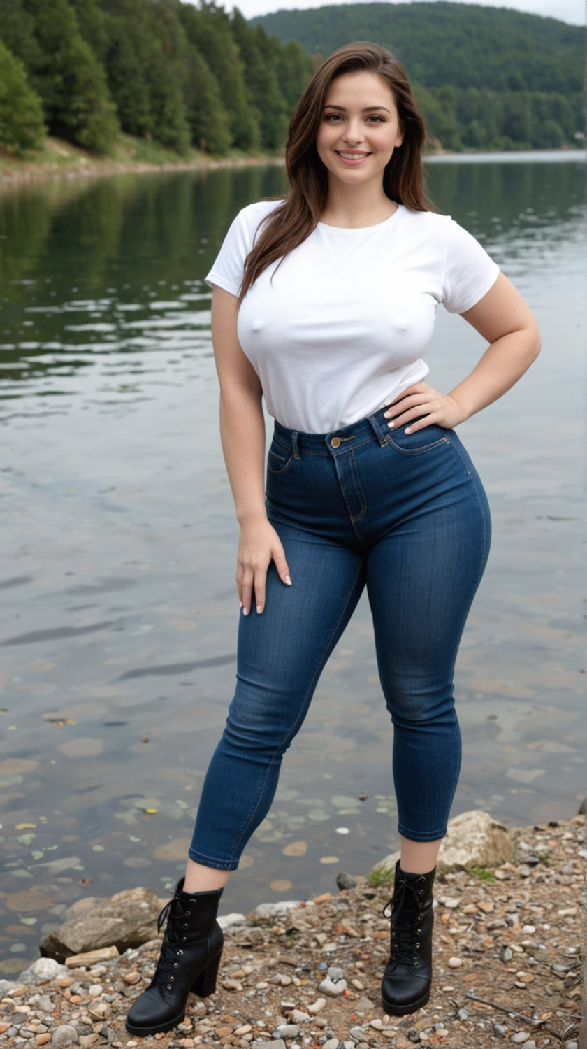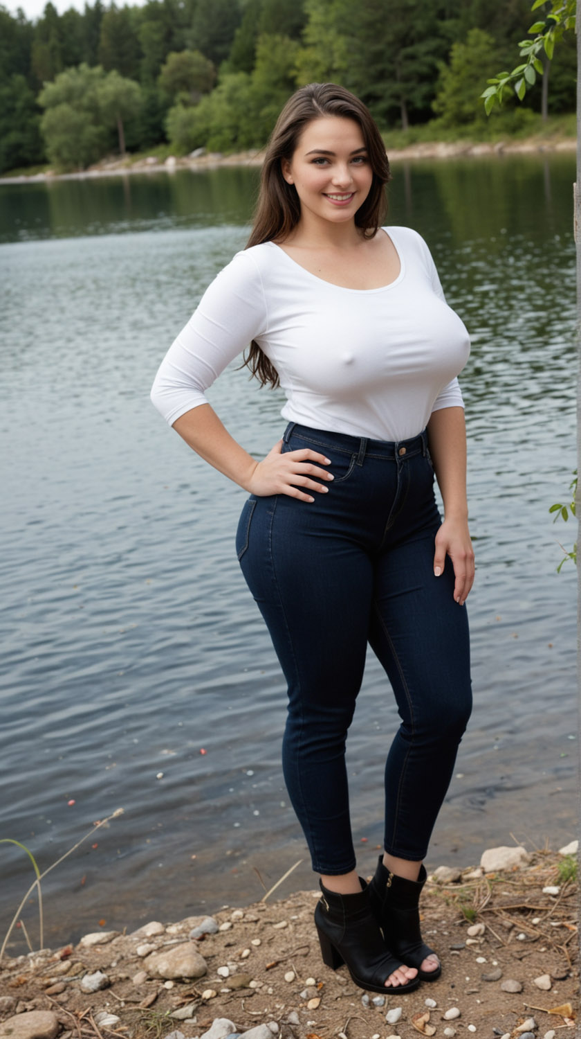 The image is a portrait of a young woman standing in front of a lake. She is wearing a white t-shirt, blue jeans, and brown ankle boots. She has long brown hair and is smiling at the camera. The woman is standing with her hands on her hips and her body is slightly turned to the side. The lake is surrounded by trees and there are rocks and fallen leaves scattered around. The sky is blue and the overall mood of the image is peaceful and serene.