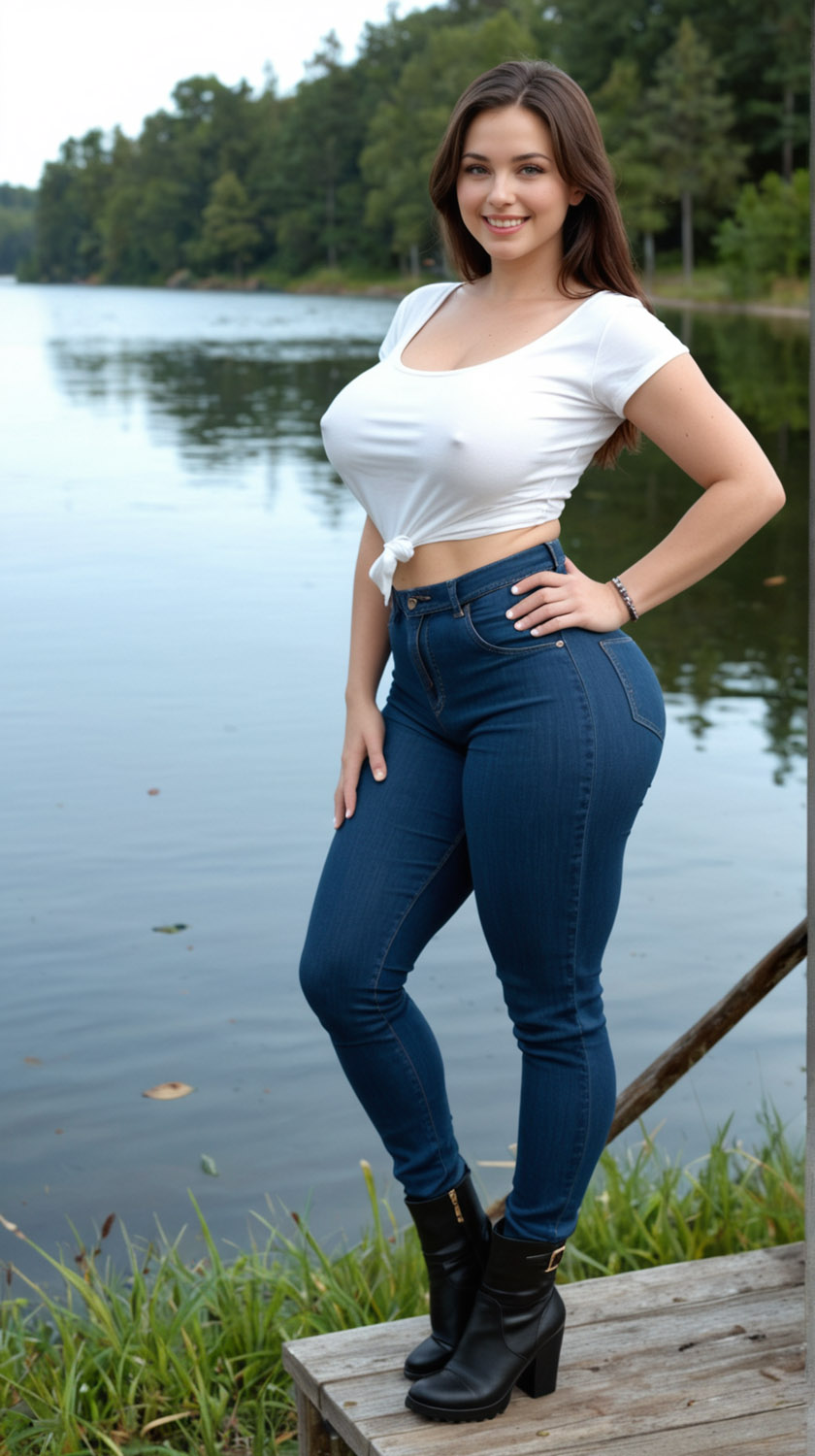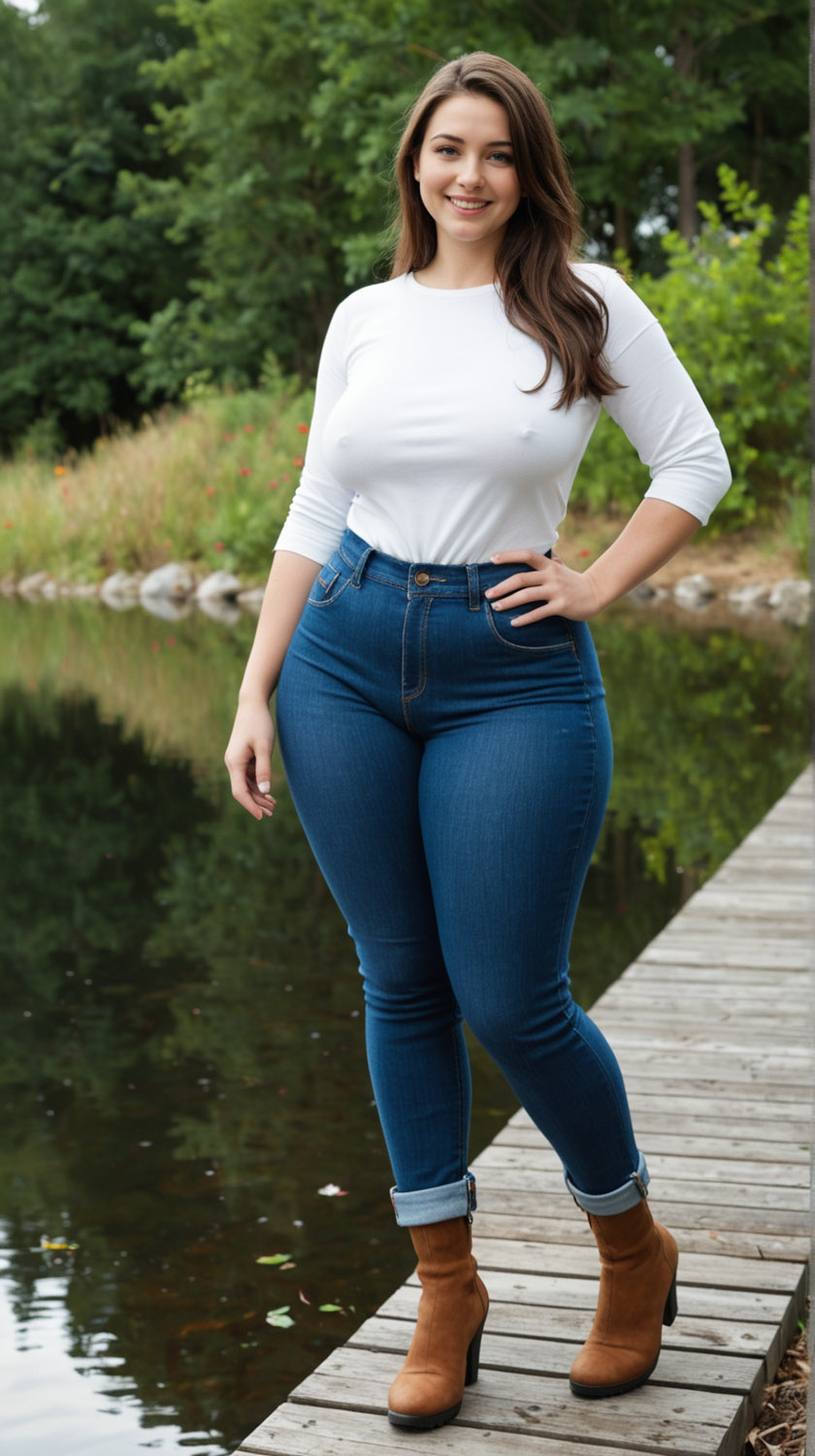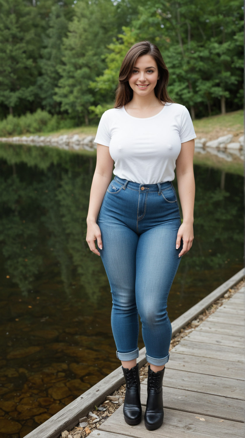 The image is a portrait of a young woman standing in front of a lake. She is wearing a white t-shirt and blue jeans, with black ankle boots. She has long brown hair and is smiling at the camera. The woman is standing with her hands on her hips and her body is slightly turned to the side. The lake is surrounded by trees and greenery, and there is a wooden fence in the background. The overall mood of the image is happy and relaxed.