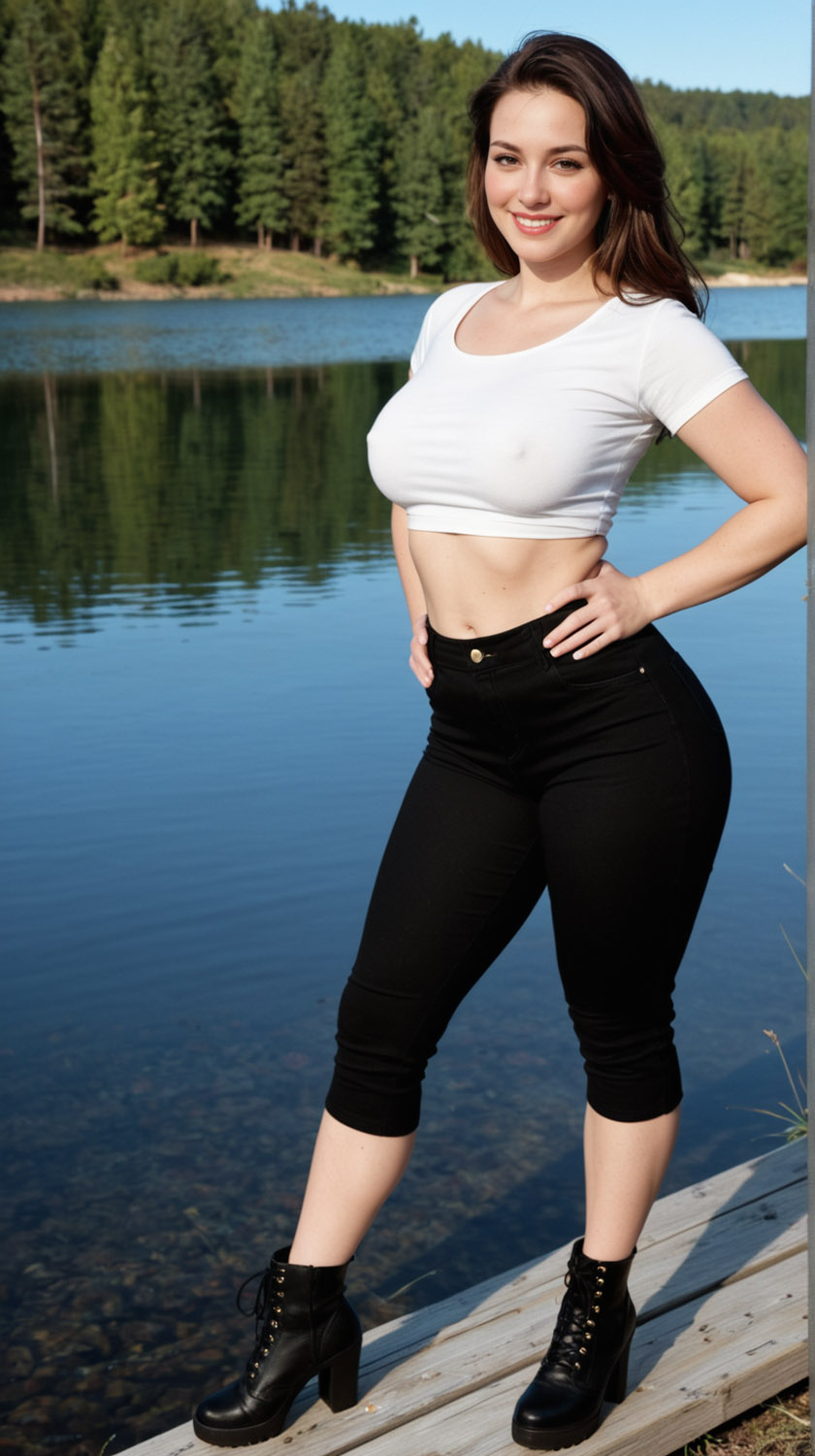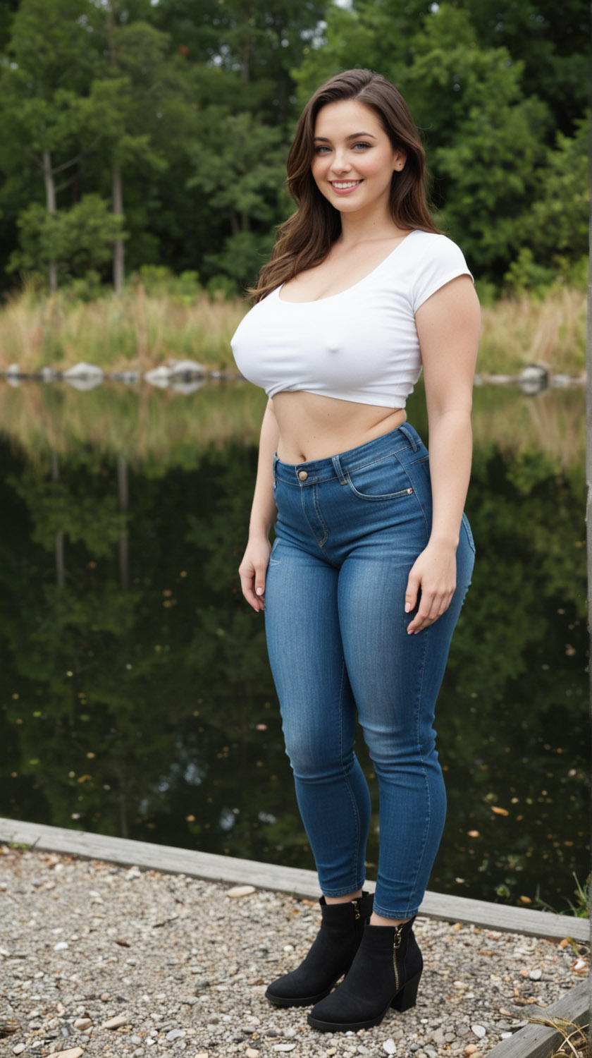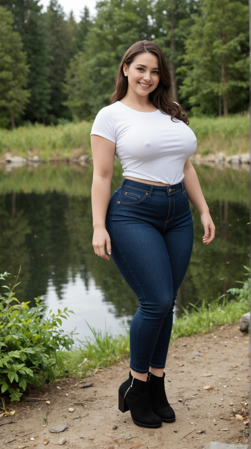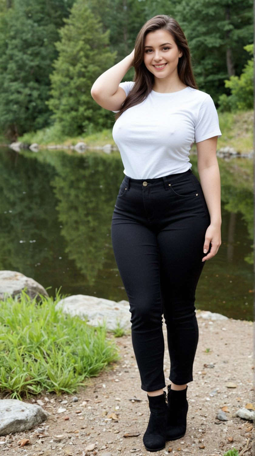 The image is a portrait of a young woman standing in front of a lake. She is wearing a white t-shirt and blue jeans, with black ankle boots. She has long brown hair and is smiling at the camera. The woman is standing with her hands on her hips and her body is slightly turned to the side. The lake is surrounded by trees and greenery, and there is a wooden fence in the background. The overall mood of the image is happy and relaxed.