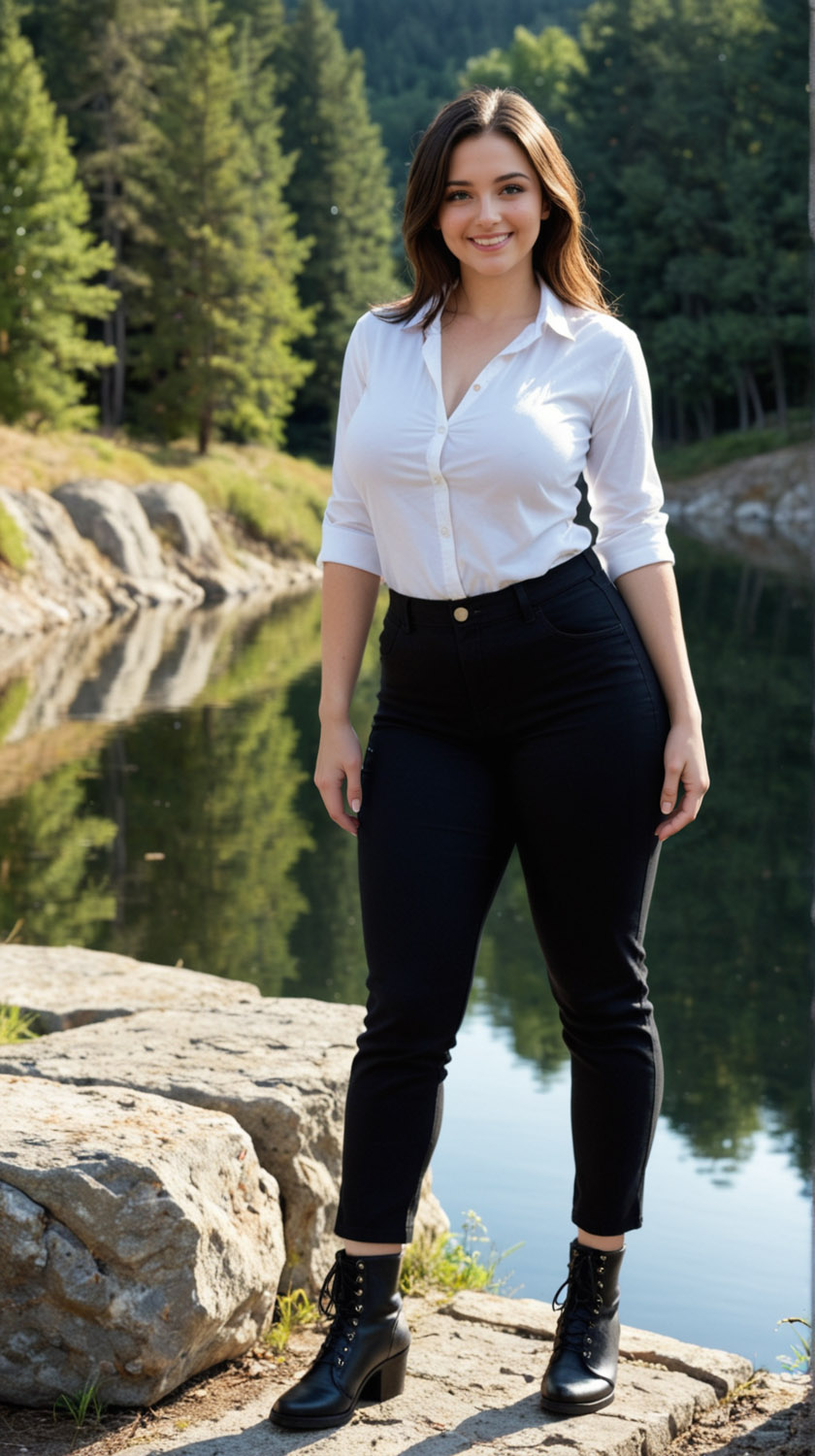 The image shows a young woman standing on a rock near a lake. She is wearing a white button-down shirt and black high-waisted jeans. She has long brown hair and is smiling at the camera. The woman is standing with her hands in her pockets and is wearing black ankle boots. The background shows a beautiful landscape with trees and mountains in the distance. The lake is calm and the water is reflecting the trees and sky. The overall mood of the image is peaceful and serene.