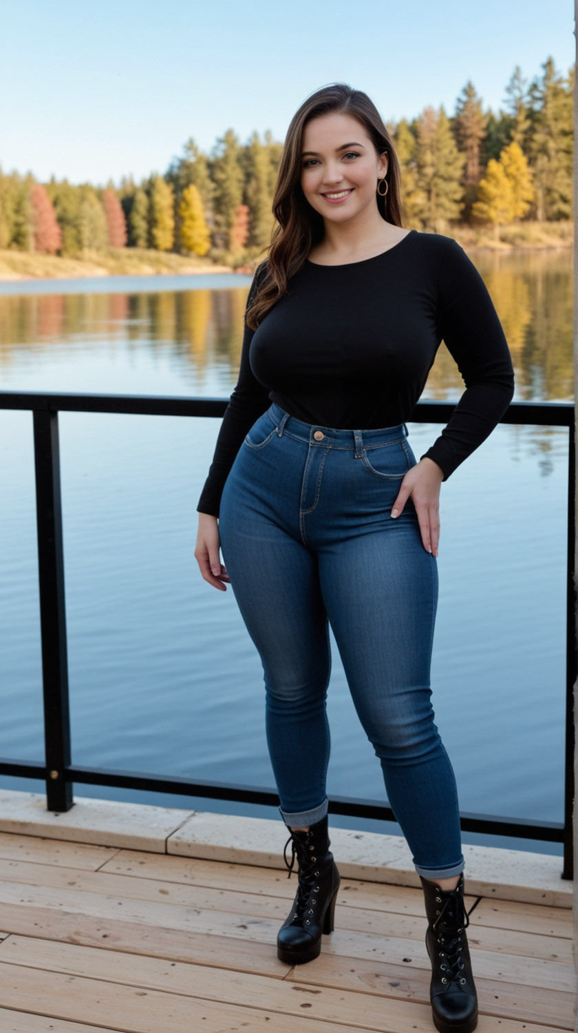 The image shows a young woman standing on a wooden deck overlooking a lake. She is wearing a black long-sleeved top and high-waisted blue jeans. She has long dark hair and is smiling at the camera. The woman is standing with her hands on her hips and is wearing black ankle boots. The background shows a lake with trees in the distance. The sky is blue and the overall mood of the image is happy and relaxed.