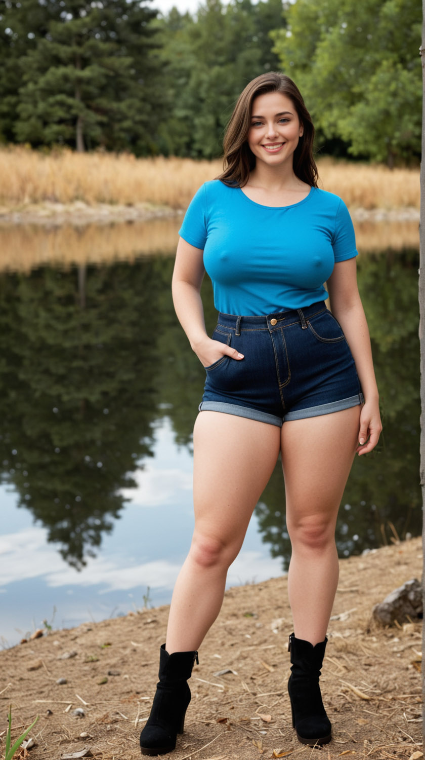 The image is a portrait of a young woman standing in front of a lake. She is wearing a blue t-shirt and denim shorts, with black ankle boots. She has long brown hair and is smiling at the camera. The lake is surrounded by trees and grass, and there is a tree trunk on the right side of the image. The woman is standing with one hand on her hip and the other resting on her thigh. The background is blurred, but it appears to be a wooded area.