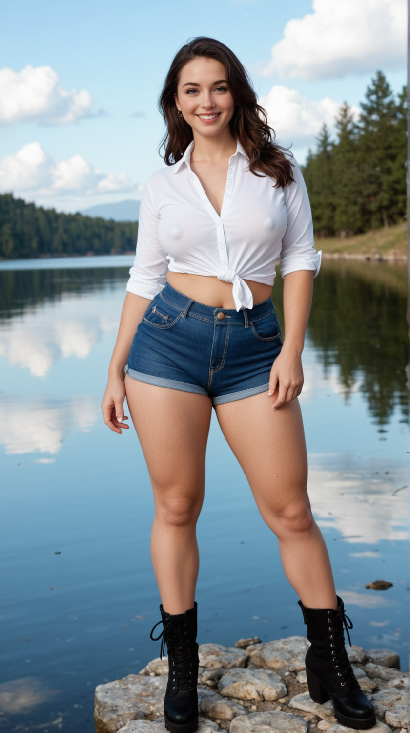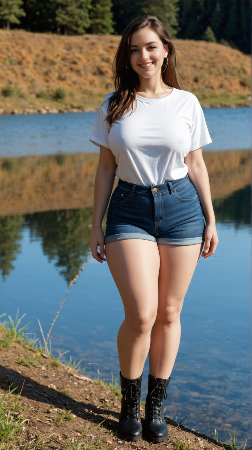 The image shows a young woman standing on the shore of a lake. She is wearing a white t-shirt, denim shorts, and black combat boots. She has long brown hair and is smiling at the camera. The lake is surrounded by trees and there is a hill in the background. The sky is blue and the water is calm. The woman is standing with one hand on her hip and the other resting on her thigh. She appears to be posing for a photo.