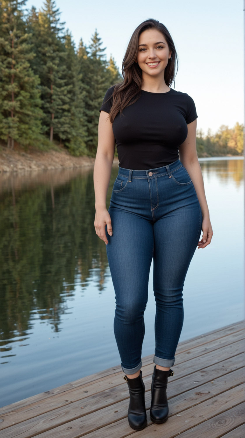 The image shows a young woman standing on a wooden dock by a lake. She is wearing a black t-shirt and high-waisted blue jeans. She has long dark hair and is smiling at the camera. The lake is surrounded by trees and the sky is blue. The woman is standing with one hand on her hip and the other resting on her thigh. She appears to be confident and relaxed.
