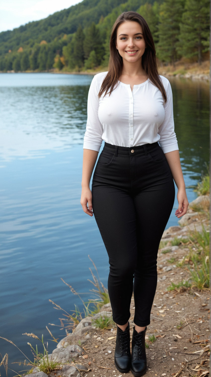 The image is a portrait of a young woman standing by a lake. She is wearing a white long-sleeved top with a deep V-neckline and dark blue jeans. She has long dark hair and is smiling at the camera. The woman is standing with her hands on her hips and is wearing black ankle boots. The background shows a beautiful view of the lake and trees. The sky is blue and the water is calm. The overall mood of the image is happy and relaxed.