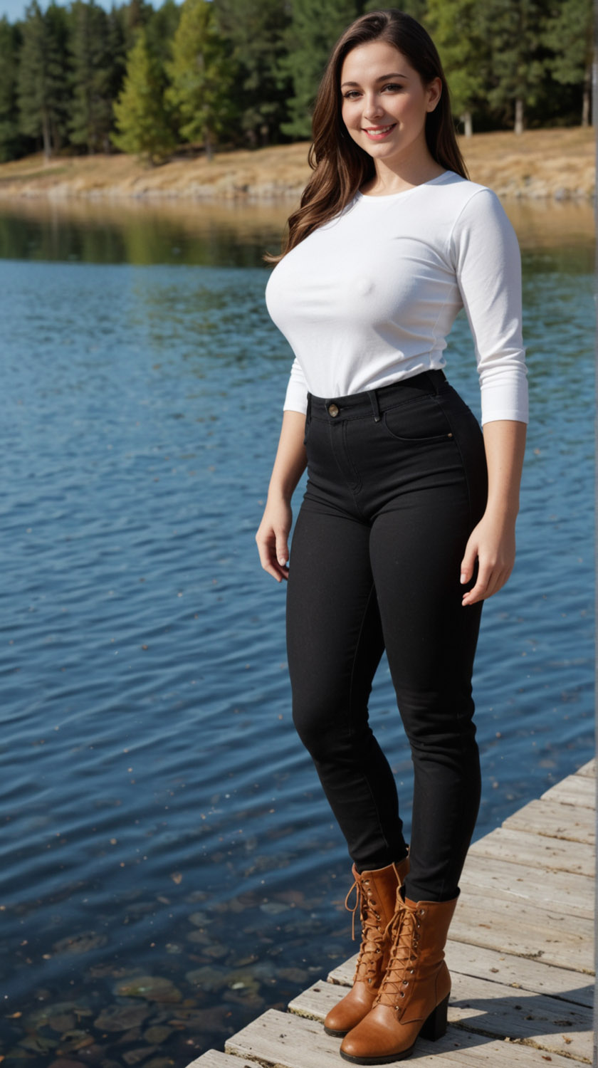 The image shows a young woman standing on a wooden dock by a lake. She is wearing a white long-sleeved top and black jeans. She has long brown hair and is smiling at the camera. The woman is also wearing brown ankle boots. The lake is calm and there are trees in the background. The sky is blue and the overall mood of the image is peaceful and serene.