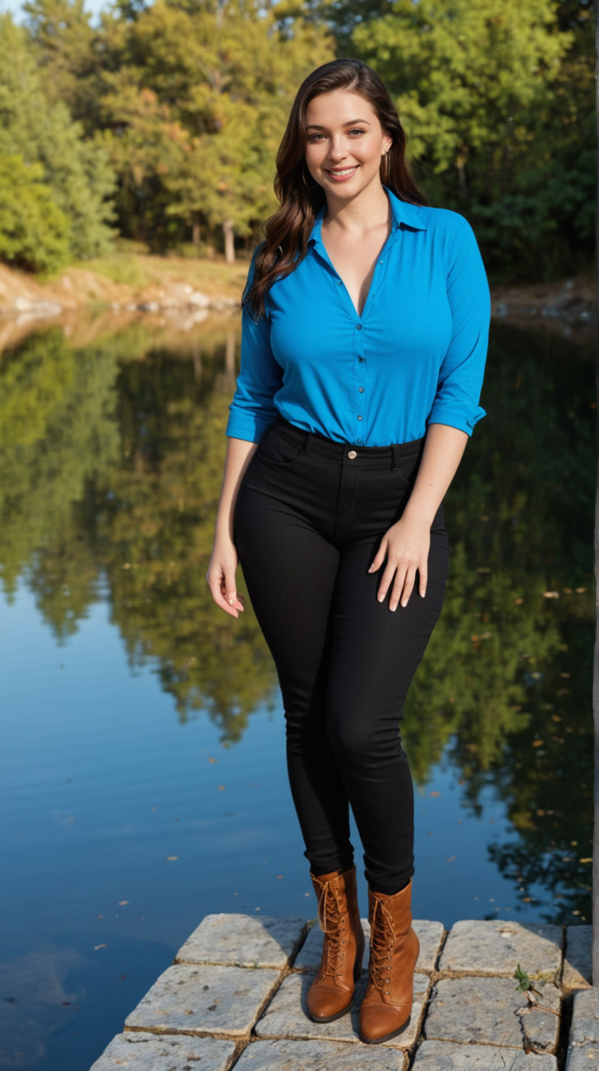 The image is a portrait of a young woman standing on a stone pathway next to a lake. She is wearing a blue button-down shirt, black jeans, and brown ankle boots. She has long brown hair and is smiling at the camera. The woman is standing with one hand on her hip and the other resting on her thigh. The background is blurred, but it appears to be a wooded area with trees and greenery. The water is calm and reflects the trees and sky. The overall mood of the image is happy and relaxed.