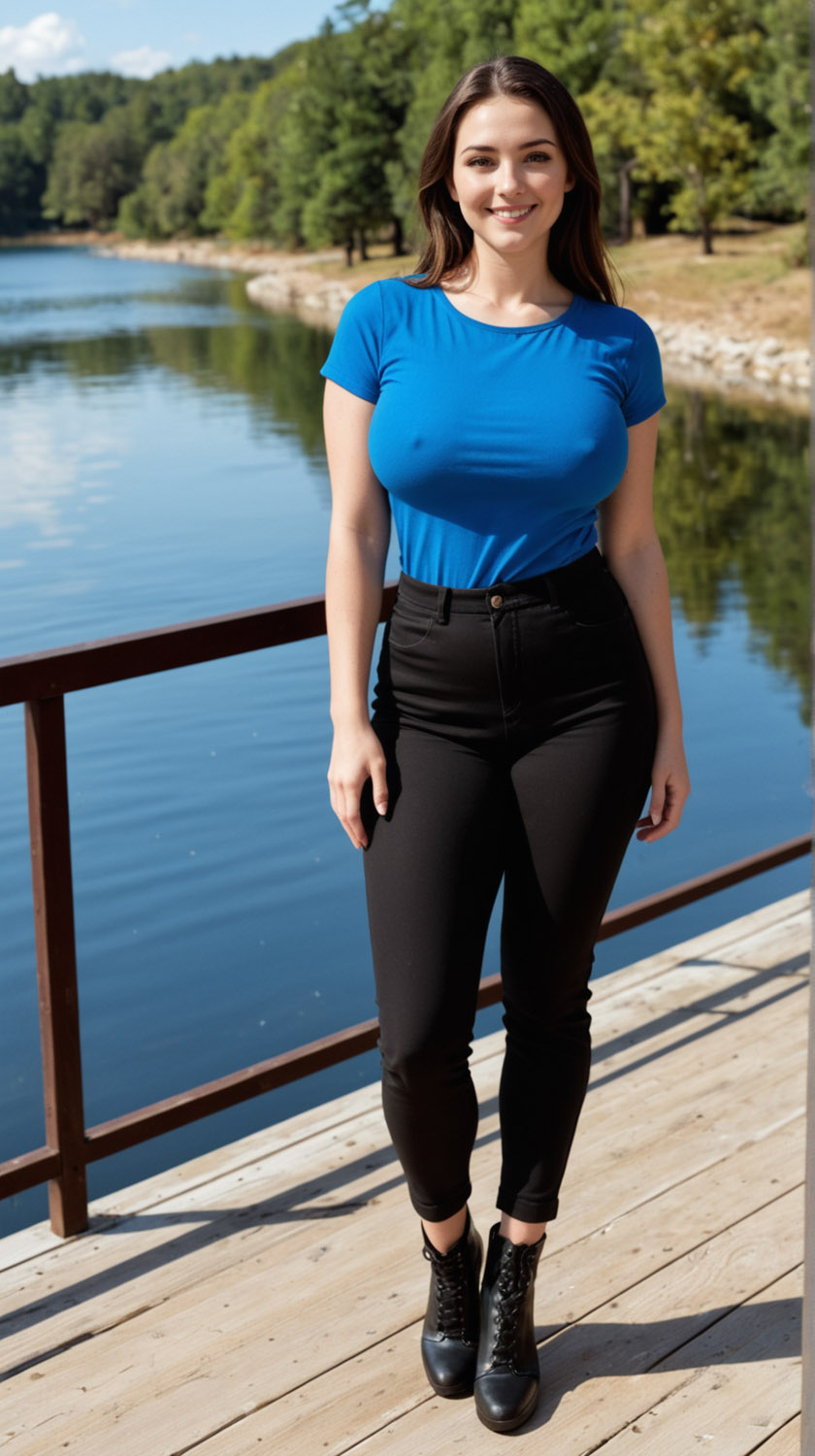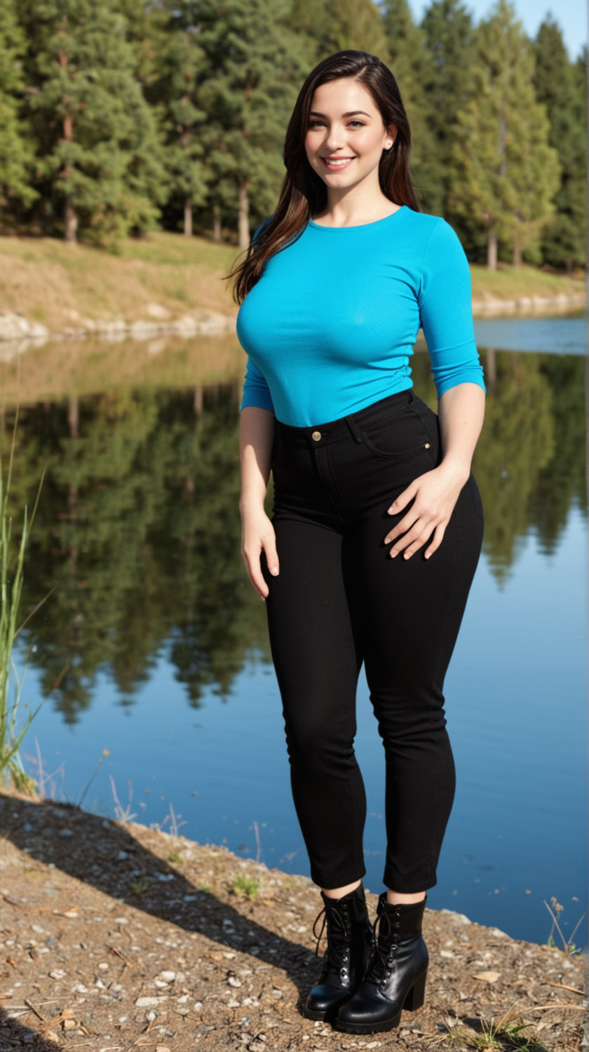 The image is a portrait of a young woman standing in front of a lake. She is wearing a turquoise t-shirt, blue jeans, and black ankle boots. She has long brown hair and is smiling at the camera. The woman is standing with her hands on her hips and is posing with one hand on her hip. The lake is surrounded by trees and greenery, and the water is calm and still. The sky is blue and the overall mood of the image is peaceful and serene.