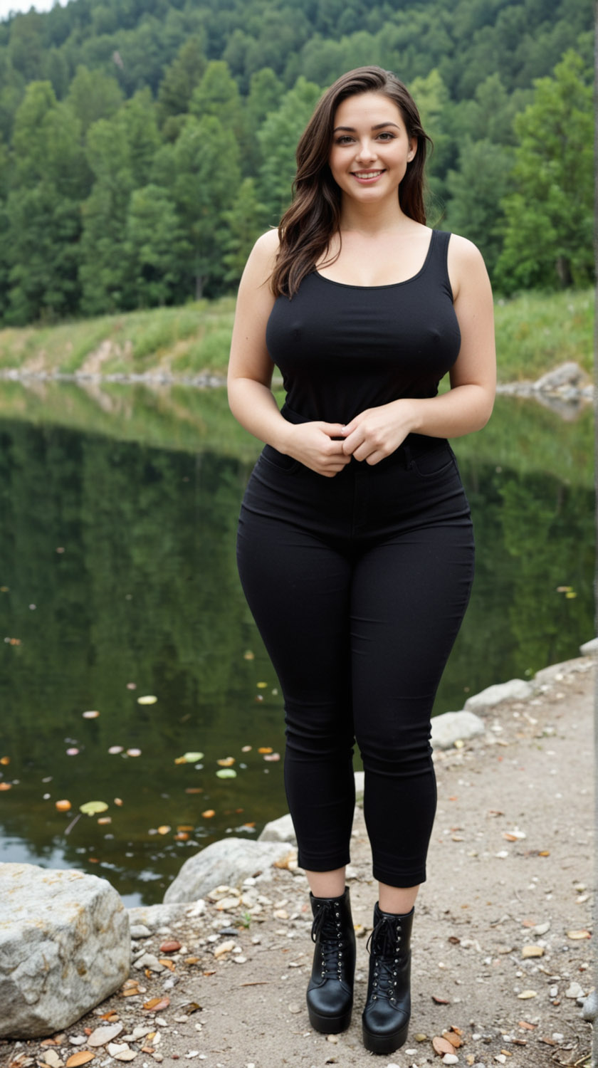 The image shows a young woman standing in front of a lake in a wooded area. She is wearing a black tank top and high-waisted black shorts, paired with black combat boots. She has long dark hair and is smiling at the camera. The woman is standing on a rocky shore with trees and bushes in the background. The lake is calm and there are rocks and trees surrounding it. The overall mood of the image is peaceful and serene.