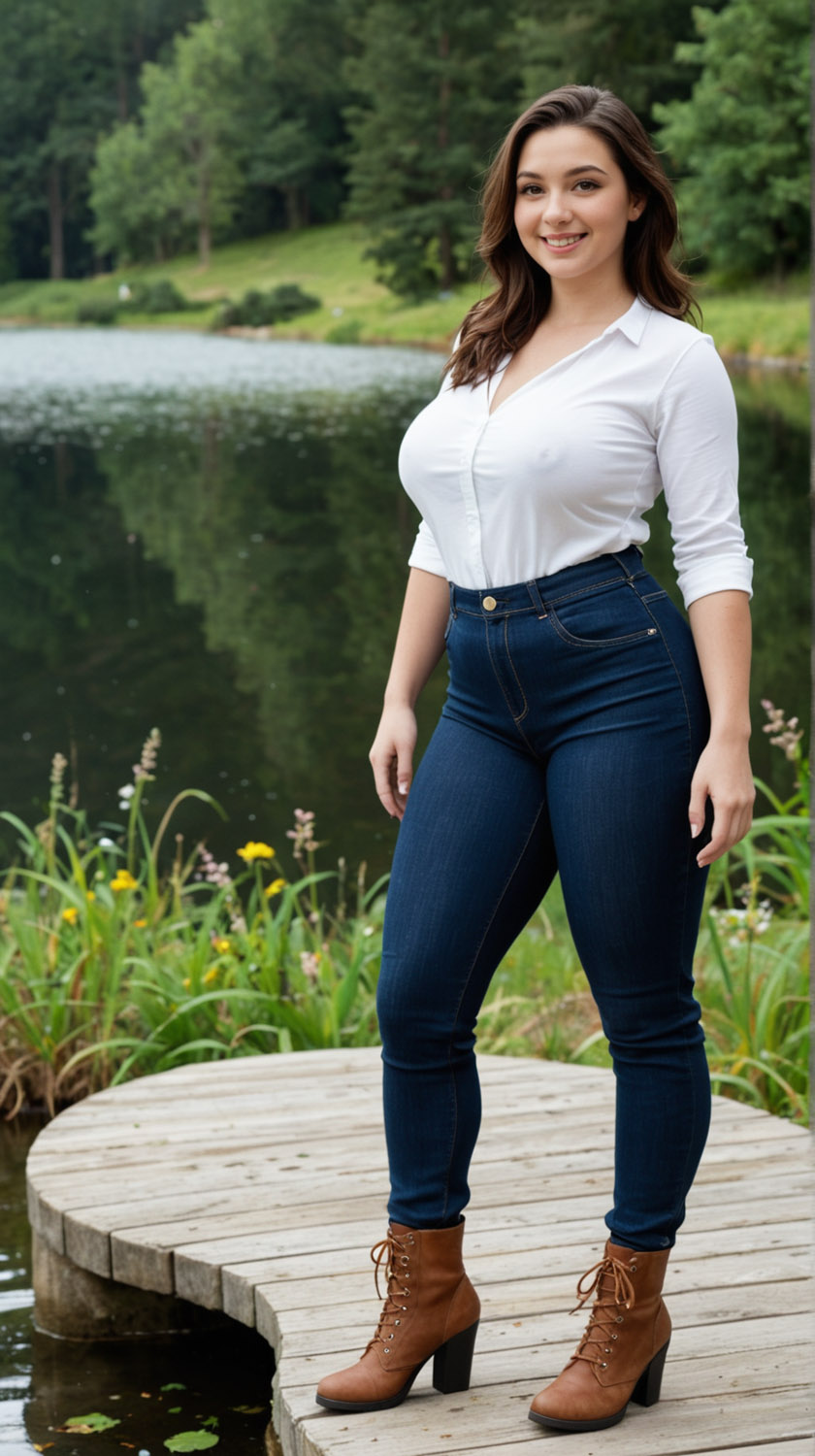 The image shows a young woman standing on a wooden boardwalk next to a lake. She is wearing a white blouse with a deep V-neck and blue jeans. She has long brown hair and is smiling at the camera. The woman is also wearing brown ankle boots with a lace-up design. The background is filled with greenery and trees, and the lake is surrounded by colorful flowers and plants. The overall mood of the image is happy and relaxed.