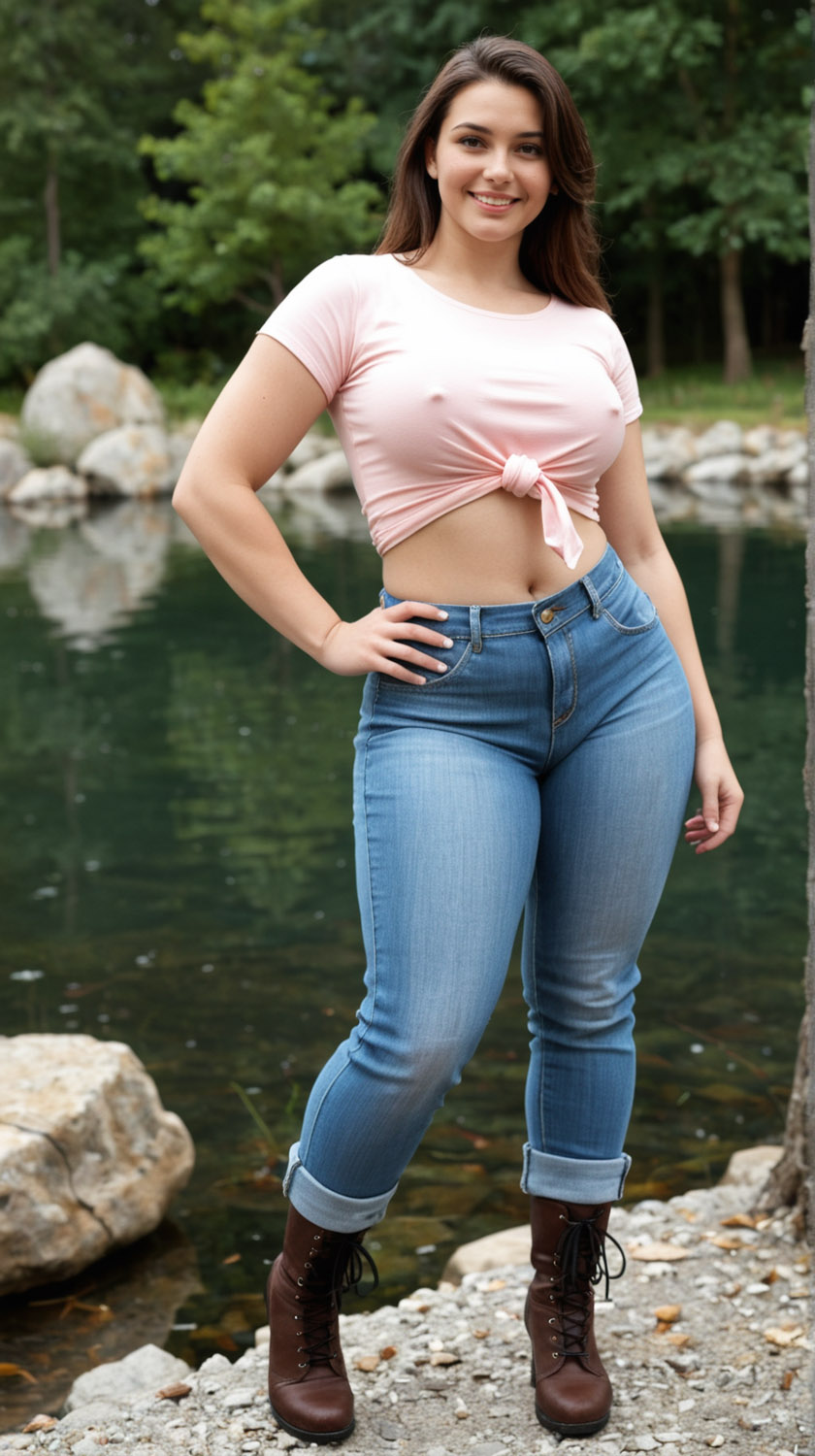 The image is a portrait of a young woman standing in front of a lake. She is wearing a pink crop top with a knot detail on the front and blue jeans. She has long brown hair and is smiling at the camera. The woman is standing with her hands on her hips and is posing with one hand on her hip. The background is filled with trees and rocks, and the lake is visible in the distance. The overall mood of the image is happy and relaxed.