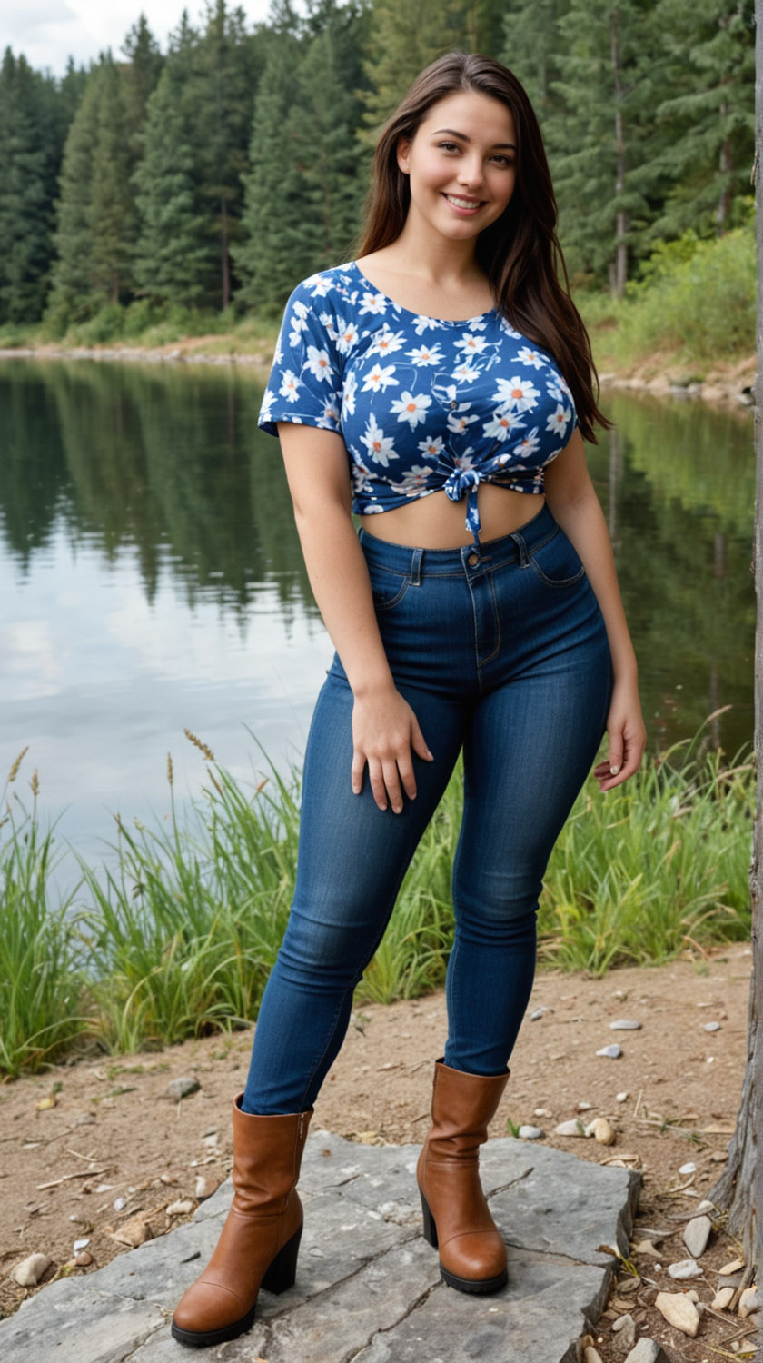 The image shows a young woman standing on a rock near a lake. She is wearing a blue floral crop top with white daisies and blue jeans. She has long brown hair and is smiling at the camera. The woman is standing with one hand on her hip and the other resting on her thigh. She also has a pair of brown ankle boots on her feet. The background shows a forested area with trees and a lake in the distance. The sky is overcast and the overall mood of the image is peaceful and serene.