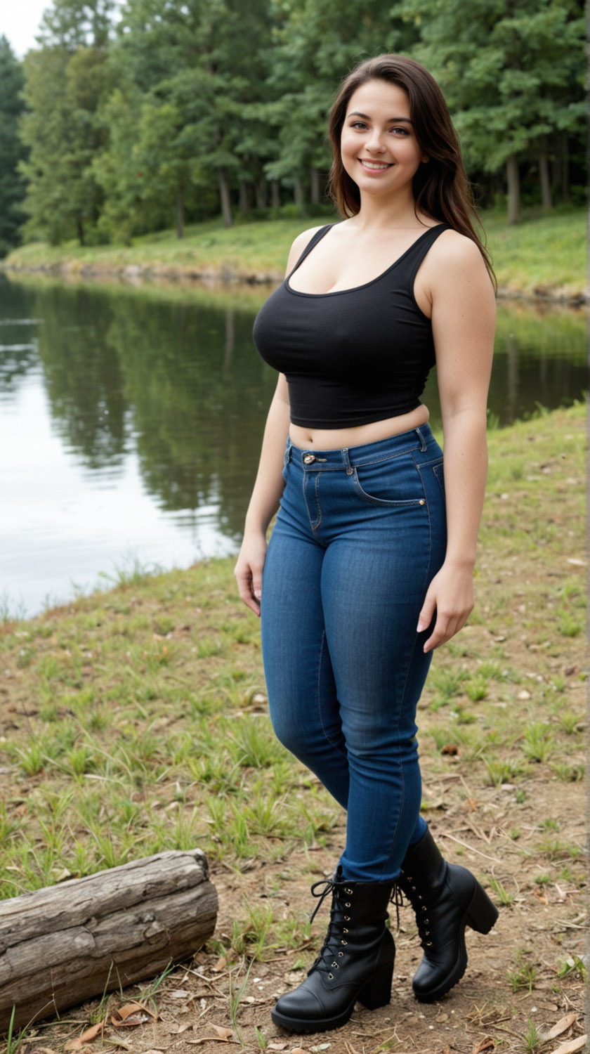 The image is a portrait of a young woman standing in front of a lake. She is wearing a black tank top and blue jeans, paired with black ankle boots. She has long dark hair and is smiling at the camera. The lake is surrounded by trees and there is a fallen tree trunk on the ground next to her. The sky is overcast and the overall mood of the image is peaceful and serene.