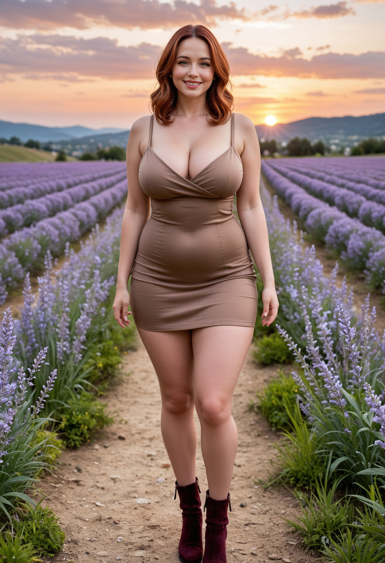 - boots, breasts, brown dress, brown eyes, brown hair, cleavage, curvy, dress, field, flower, freckles, full body, grass, large breasts, lips, looking at viewer, outdoors, realistic, smile, solo, standing
