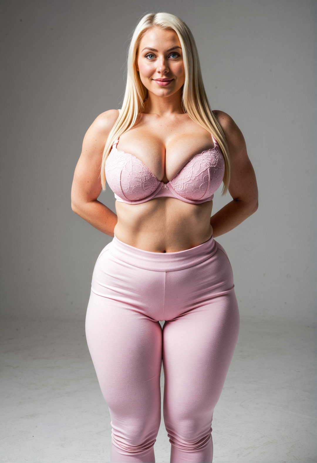 - arms behind back, blonde hair, blue eyes, bra, breasts, cleavage, curvy, freckles, grey background, large breasts, lips, long hair, looking at viewer, navel, nose, pants, pink bra, realistic, smile, solo, standing, underwear