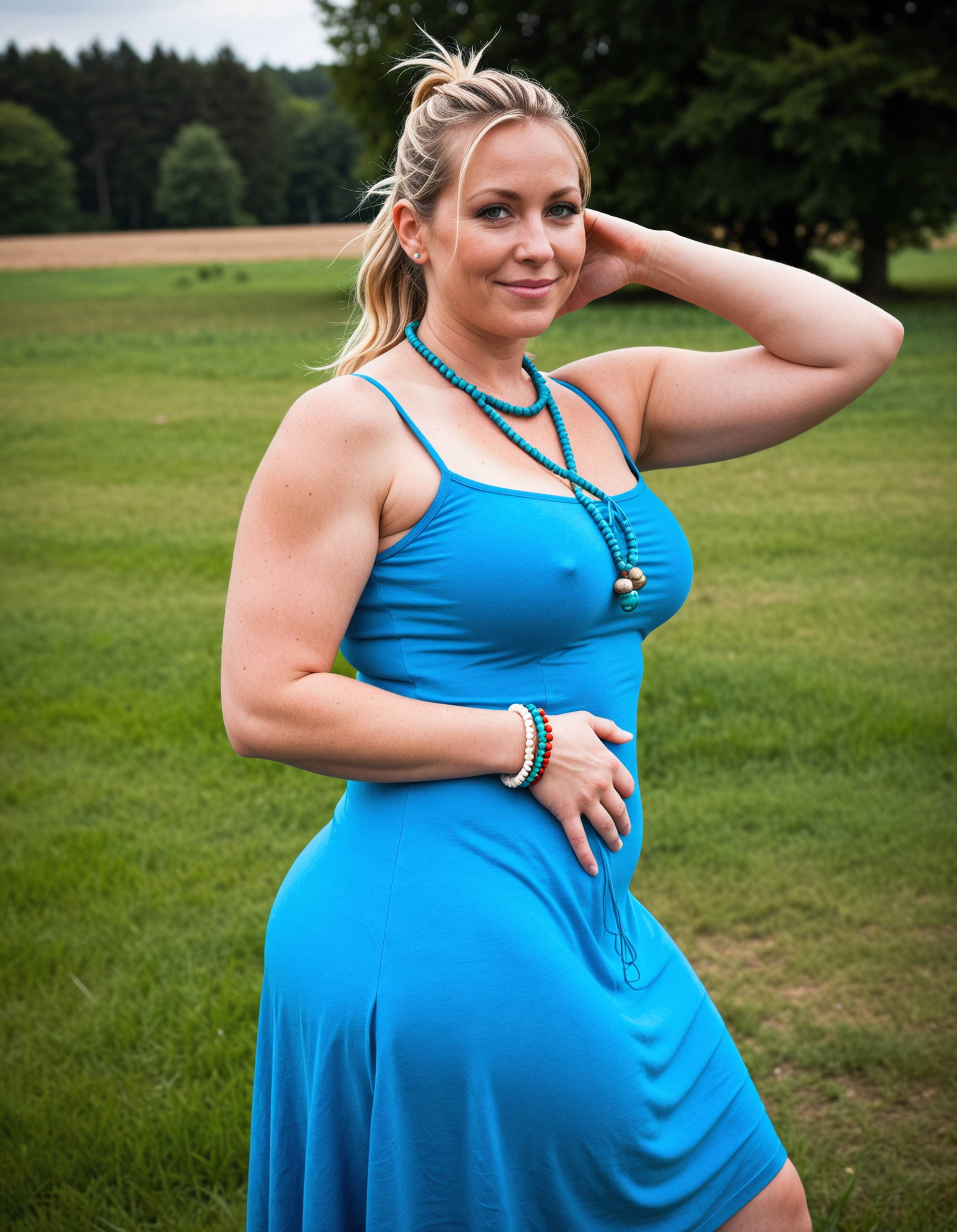 - blonde hair, blue dress, blurry, blurry background, bracelet, breasts, cosplay, covered nipples, dress, freckles, grass, jewelry, looking at viewer, medium breasts, necklace, outdoors, realistic, smile, solo