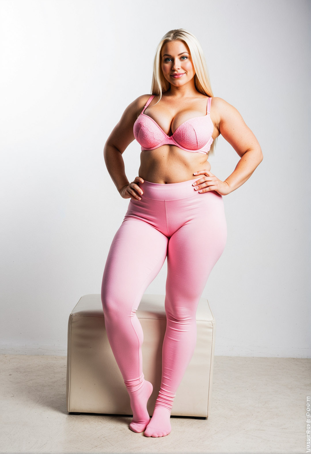 - blonde hair, box, bra, breasts, cleavage, full body, hands on hips, large breasts, lips, long hair, looking at viewer, navel, pants, pink bra, pink pants, realistic, smile, solo, standing, underwear