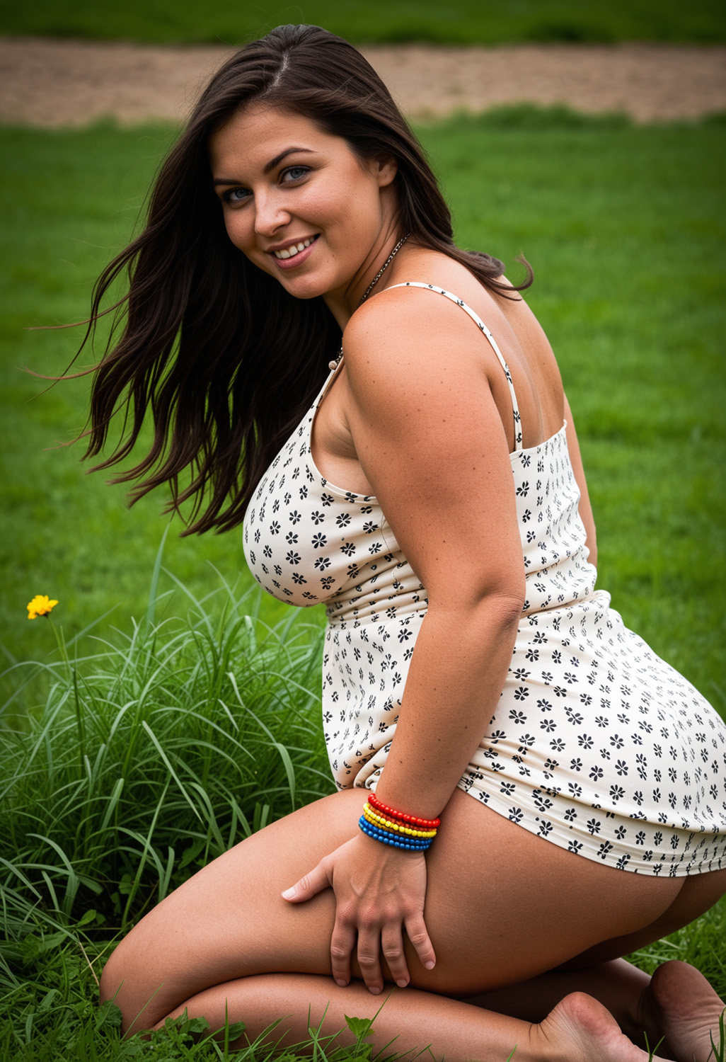 - ass, barefoot, black hair, bracelet, breasts, dirty, dirty feet, dress, feet, freckles, grass, jewelry, kneeling, large breasts, long hair, looking at viewer, realistic, smile, soles, solo