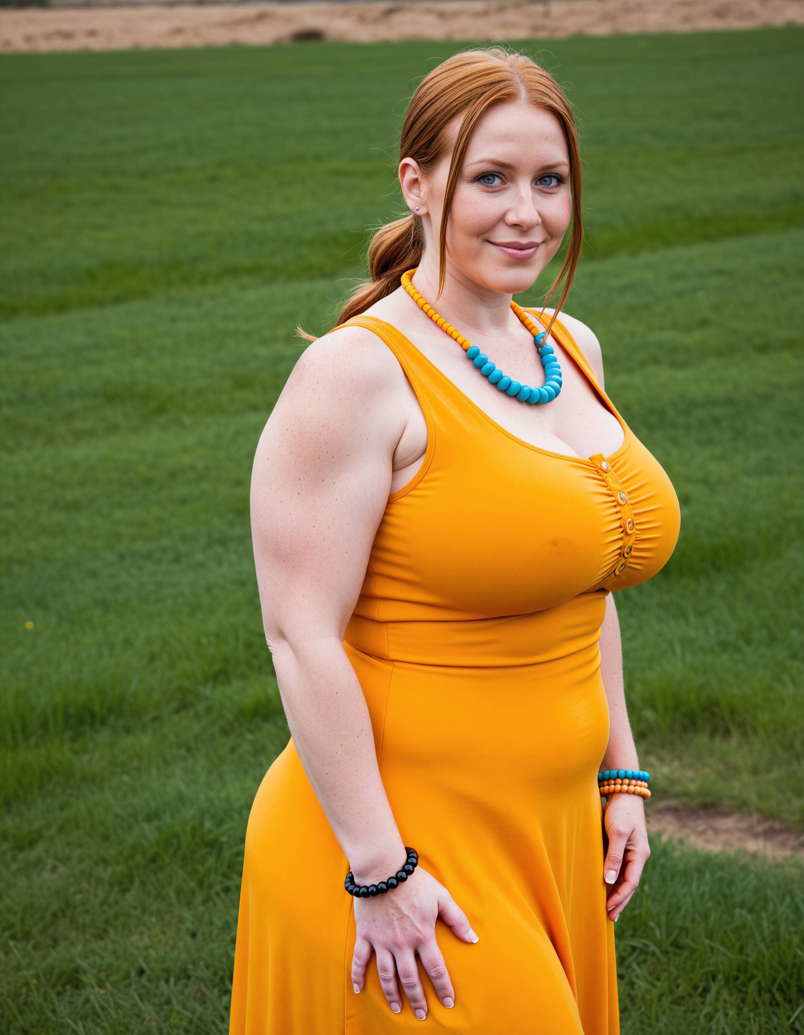 - bead bracelet, beads, blue eyes, bracelet, breasts, brown hair, cleavage, cosplay, dress, fat, freckles, grass, jewelry, large breasts, looking at viewer, necklace, outdoors, pearl necklace, plump, realistic, sensitive, sleeveless, smile, solo, standing