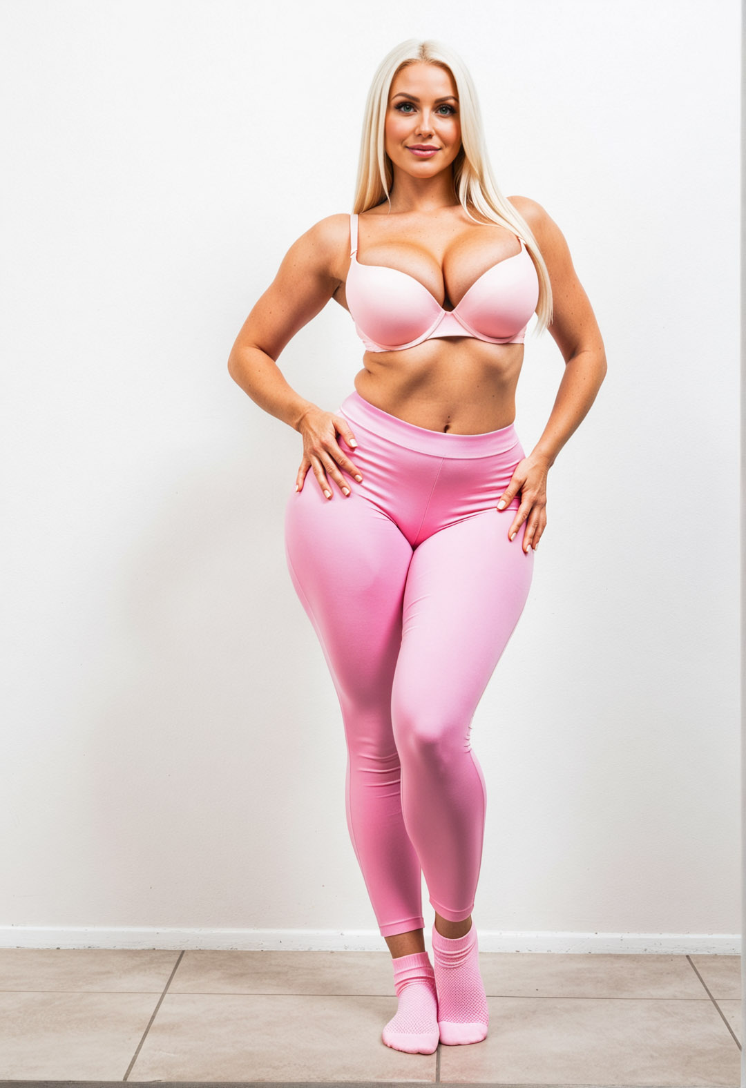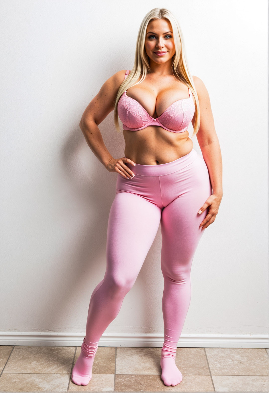 - blonde hair, bra, breasts, cleavage, curvy, fingernails, full body, hands on hips, large breasts, lips, long hair, looking at viewer, nail polish, navel, pants, pink bra, pink pants, realistic, smile, socks, solo, standing, underwear