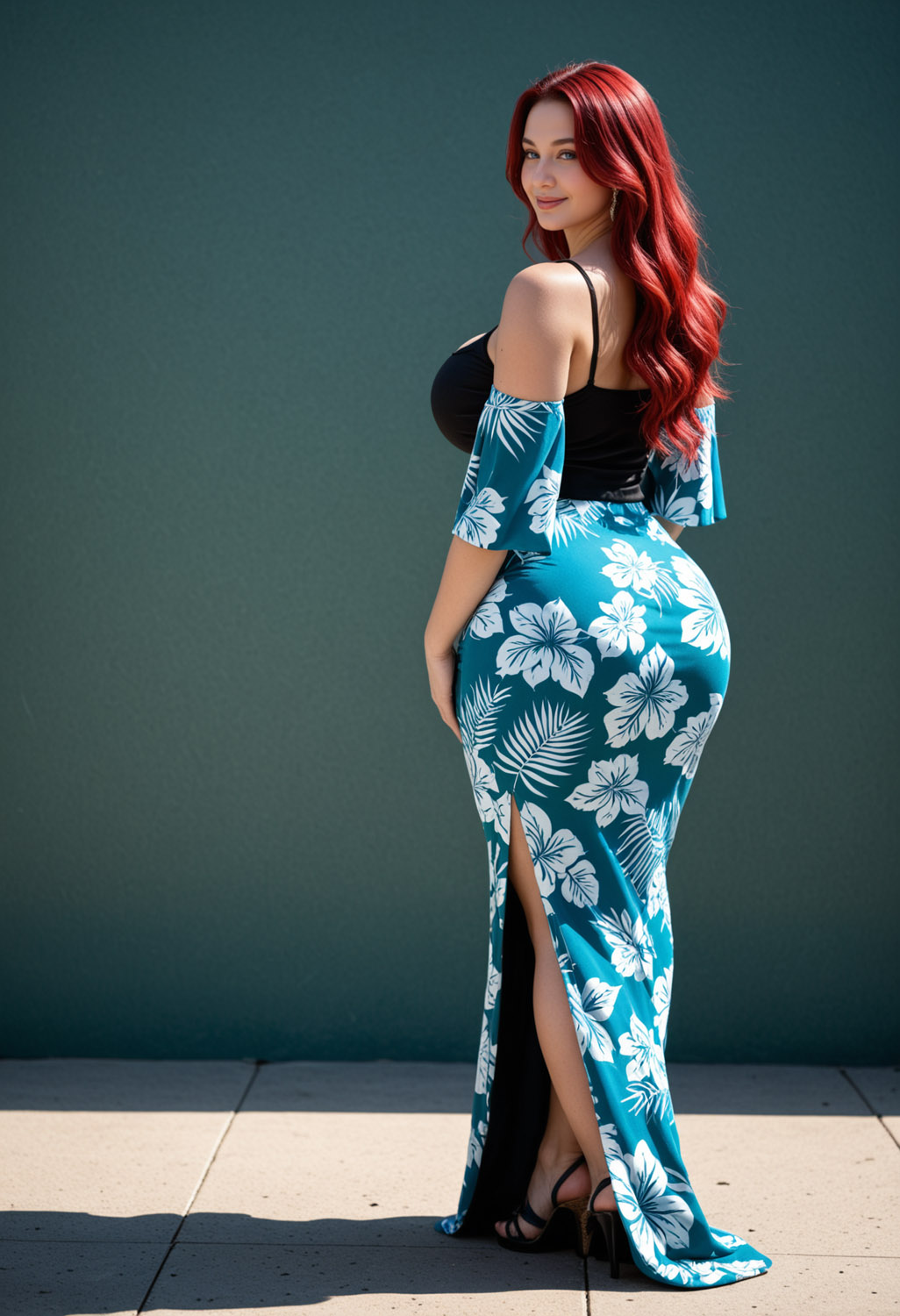 - ass, blue dress, blue eyes, breasts, dress, floral print, from behind, full body, high heels, lips, long hair, looking at viewer, looking back, orange hair, realistic, solo, standing