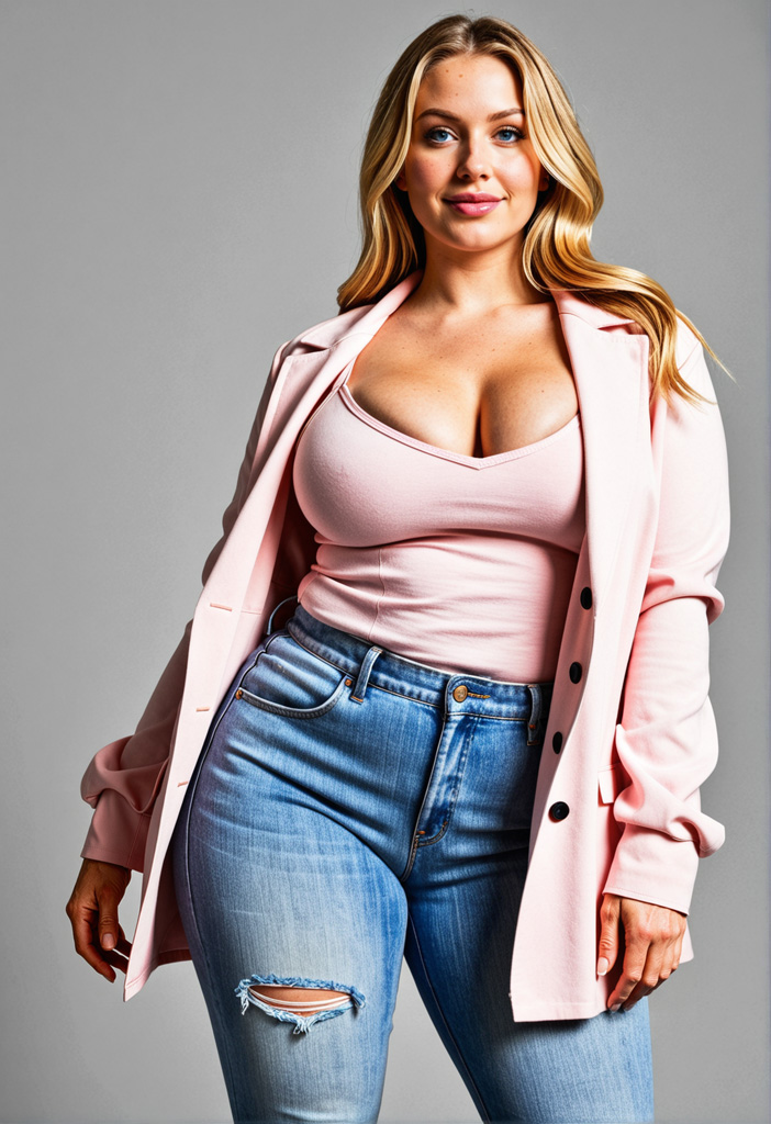 - blonde hair, blue eyes, breasts, buttons, cleavage, denim, high-waist pants, huge breasts, jeans, large breasts, lips, long hair, long sleeves, looking at viewer, open clothes, pants, realistic, smile, solo, standing, torn clothes, torn jeans, torn pants, unbuttoned
