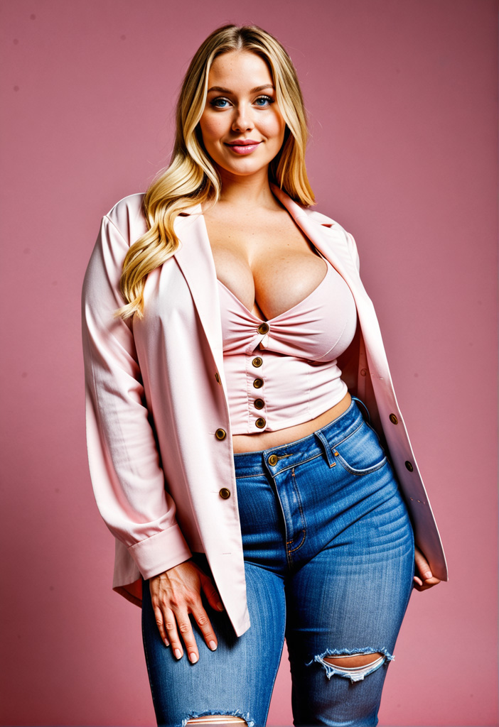 - blonde hair, blue eyes, breasts, cleavage, denim, freckles, jacket, jeans, large breasts, lips, long hair, looking at viewer, pants, pink background, realistic, smile, solo, torn clothes, torn jeans, torn pants