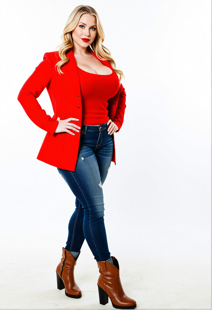 - ankle boots, belt, blonde hair, blue eyes, boots, breasts, brown footwear, cleavage, closed mouth, collarbone, crossed legs, denim, full body, hands on hips, high heel boots, high heels, jacket, jeans, large breasts, lips, lipstick, long hair, long sleeves, looking at viewer, makeup, open clothes, open jacket, pants, red lips, simple background, smile, solo, standing, torn jeans, white background
