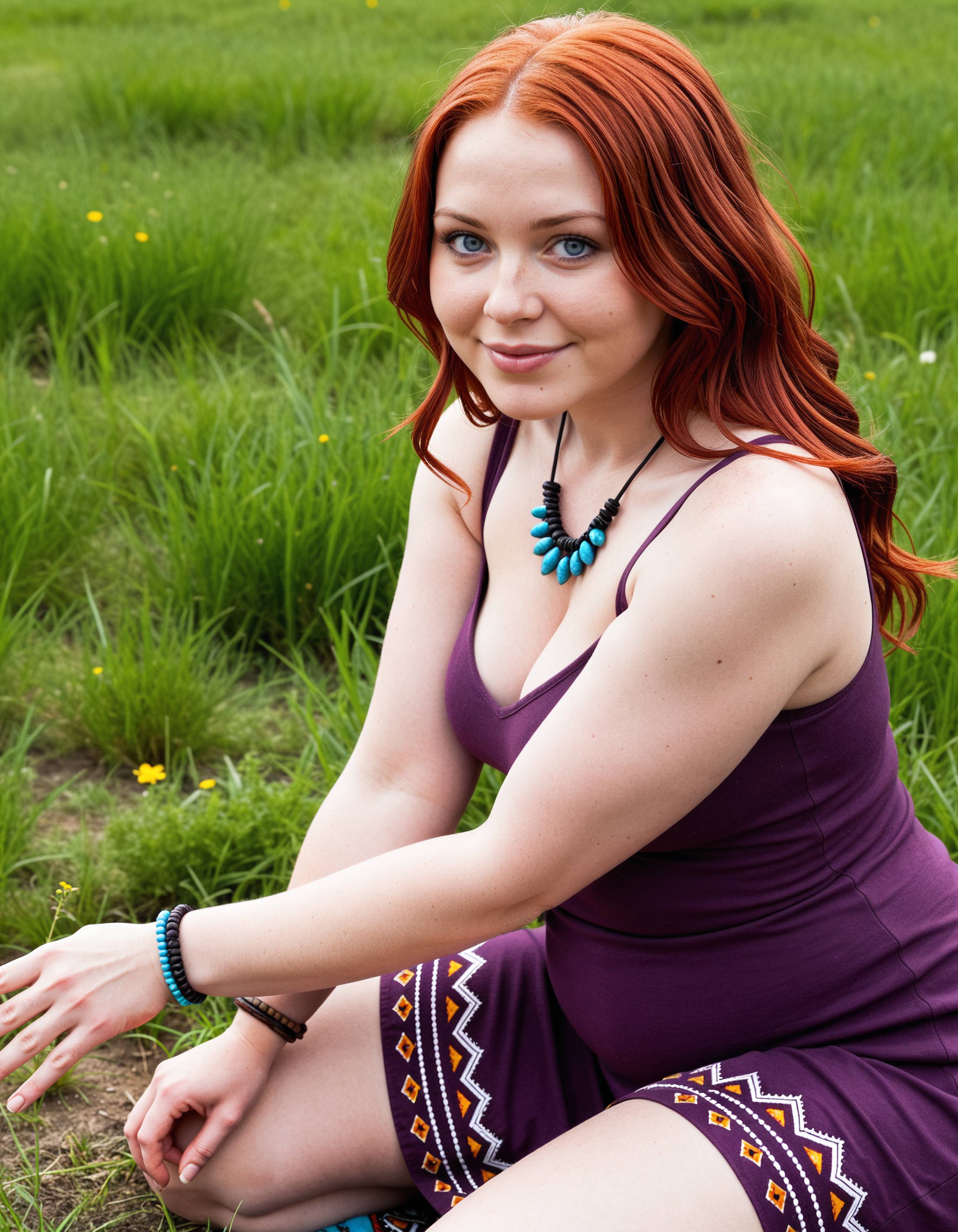 - blue eyes, bracelet, breasts, cleavage, dress, freckles, grass, jewelry, lips, long hair, looking at viewer, medium breasts, mole, necklace, outdoors, purple dress, realistic, red hair, sensitive, sitting, smile, solo