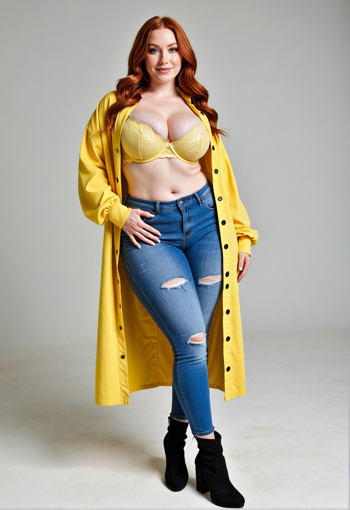 - blue eyes, blue pants, bra, breasts, brown hair, cleavage, coat, denim, freckles, grey background, jeans, large breasts, lips, long hair, long sleeves, looking at viewer, navel, no shirt, open clothes, pants, realistic, simple background, smile, solo, standing, torn clothes, torn jeans, torn pants, underwear, yellow bra