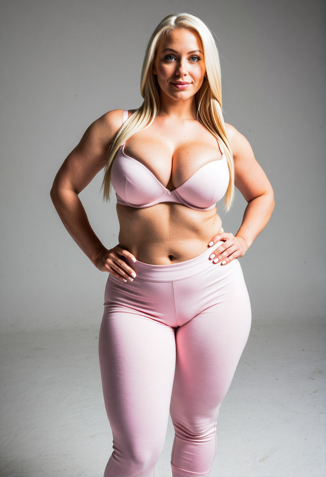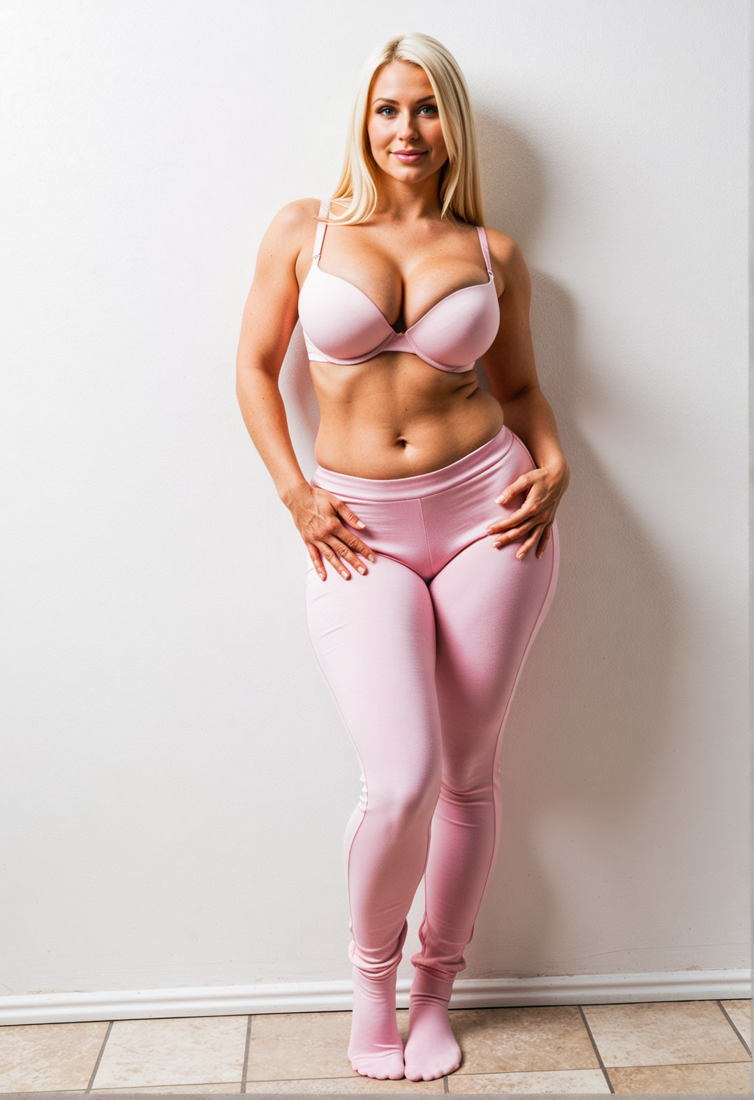 - blonde hair, bra, breasts, cleavage, curvy, full body, hands on hips, huge breasts, large breasts, lingerie, lips, long hair, looking at viewer, navel, pants, pink bra, realistic, socks, solo, standing, underwear