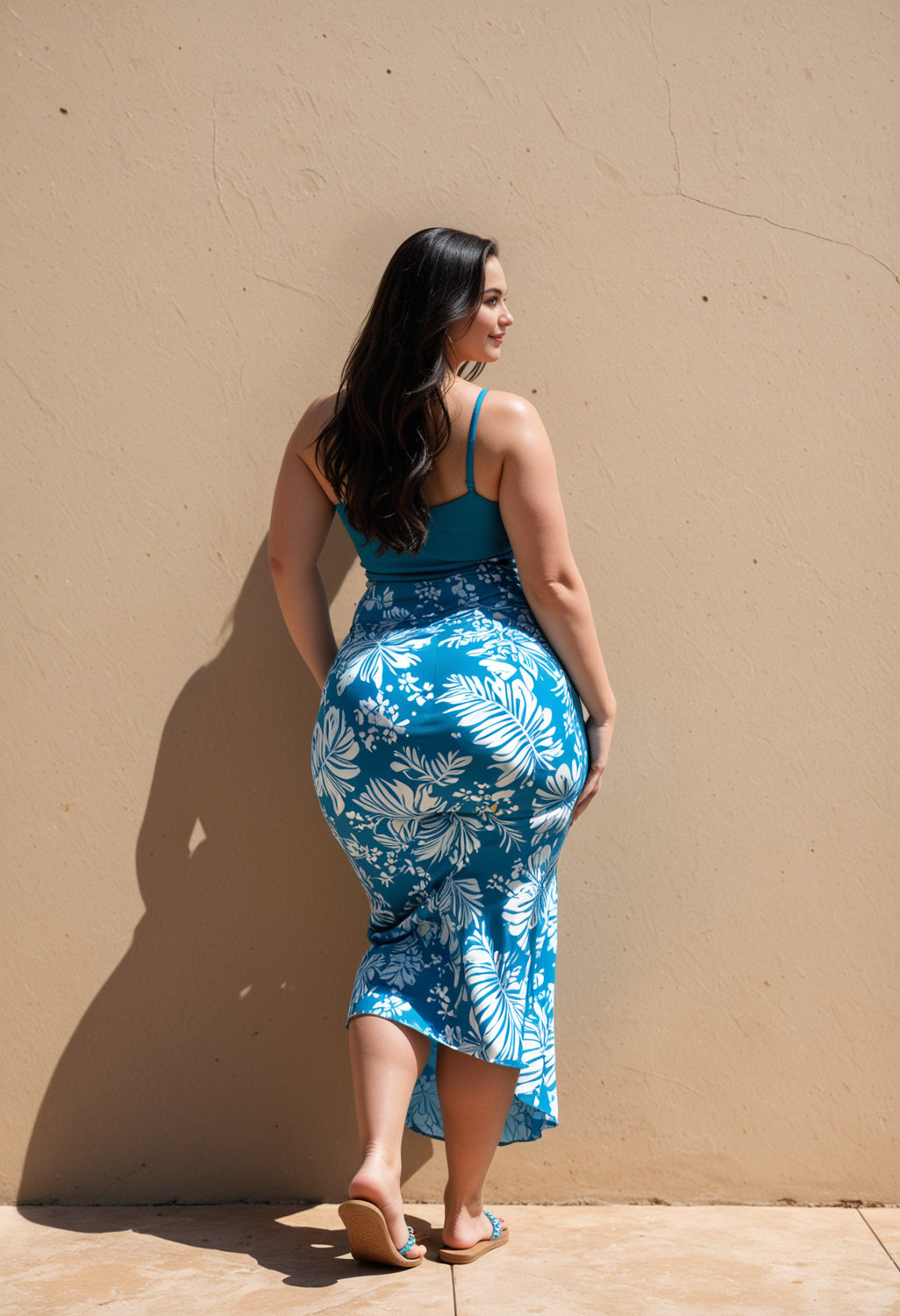 - ass, bare shoulders, black hair, blue dress, breasts, brown eyes, curvy, dress, from behind, full body, high heels, huge ass, large breasts, lips, long dress, long hair, looking at viewer, looking back, plump, sandals, shadow, smile, solo, standing, thick thighs, thighs, wide hips