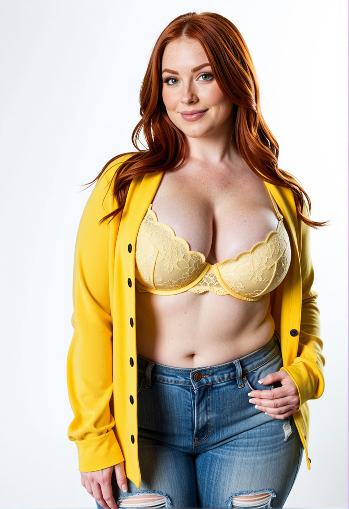- blue eyes, bra, breasts, brown hair, buttons, cardigan, cleavage, denim, freckles, huge breasts, jeans, large breasts, lips, long hair, long sleeves, looking at viewer, navel, open clothes, pants, realistic, simple background, sleeves past wrists, smile, solo, standing, torn clothes, torn jeans, torn pants, unbuttoned, underwear, white background, yellow bra