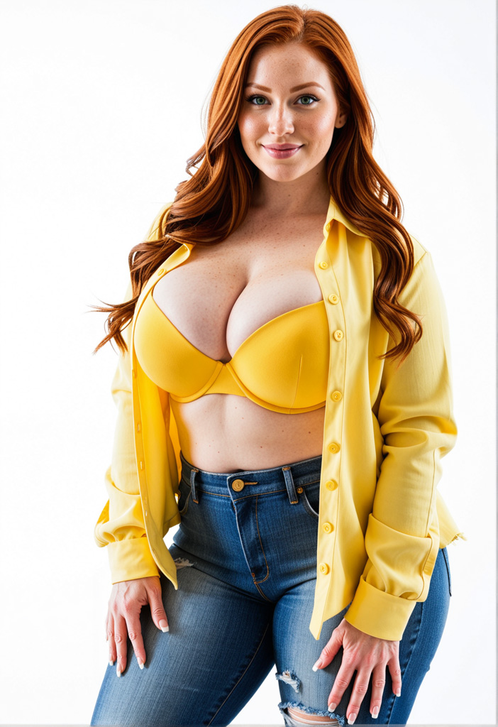 - blue eyes, bra, breasts, brown hair, cleavage, denim, freckles, jeans, large breasts, lingerie, lips, long hair, long sleeves, looking at viewer, mole, mole on breast, navel, open clothes, open shirt, pants, realistic, simple background, solo, standing, torn clothes, torn jeans, torn pants, unbuttoned, underwear, white background, yellow bra